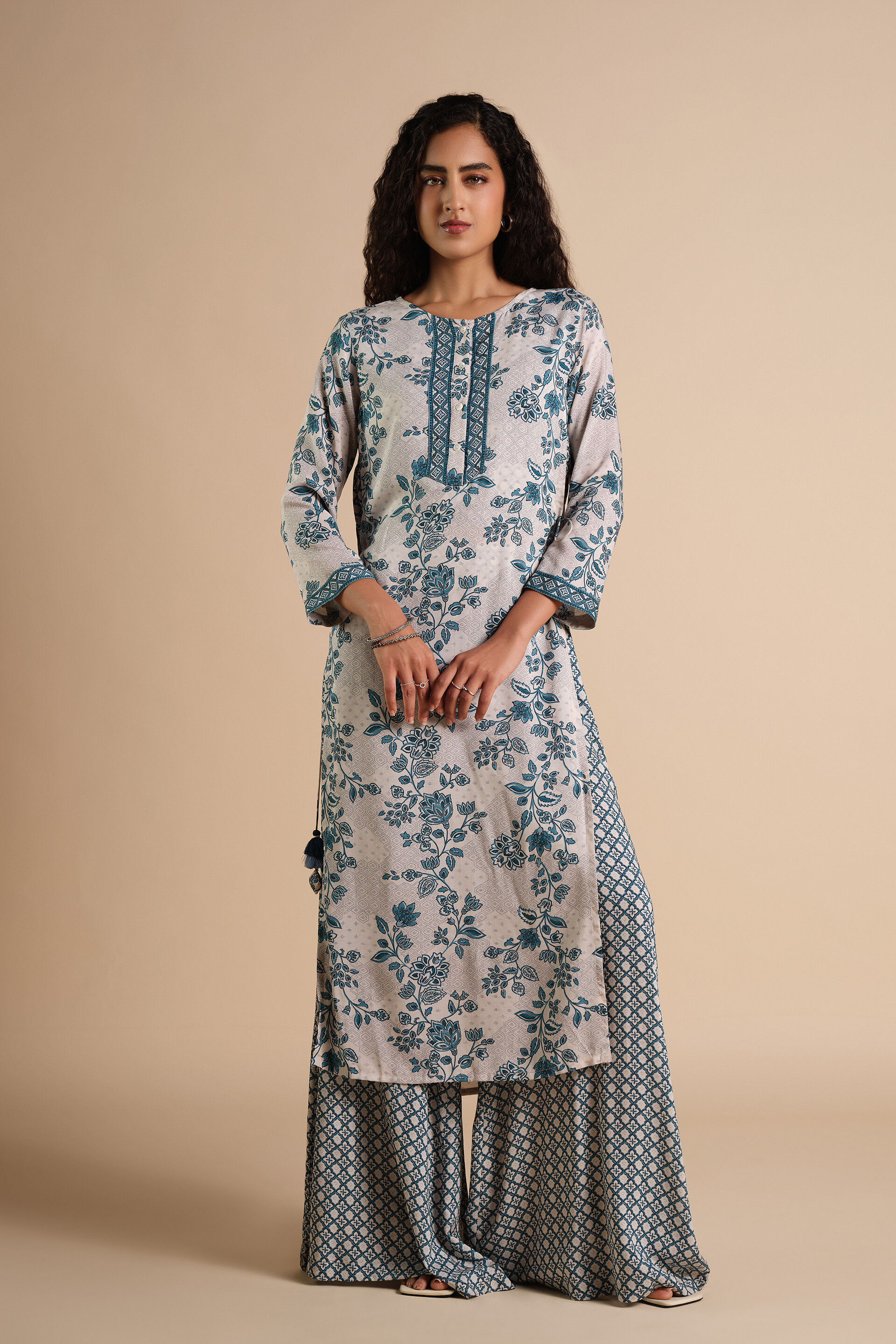 "Who doesn't like a touch of nature in their wardrobe? Crafted in a soft & soothing fabric, this kurta set features India-inspired prints. The kurta comes with three-quarter sleeves, a round neckline, and a tie-up tassel belt at the waist, ensuring a perfect fit. Paired with a relaxed bottom, you can wear this set to explore the city on the weekend.