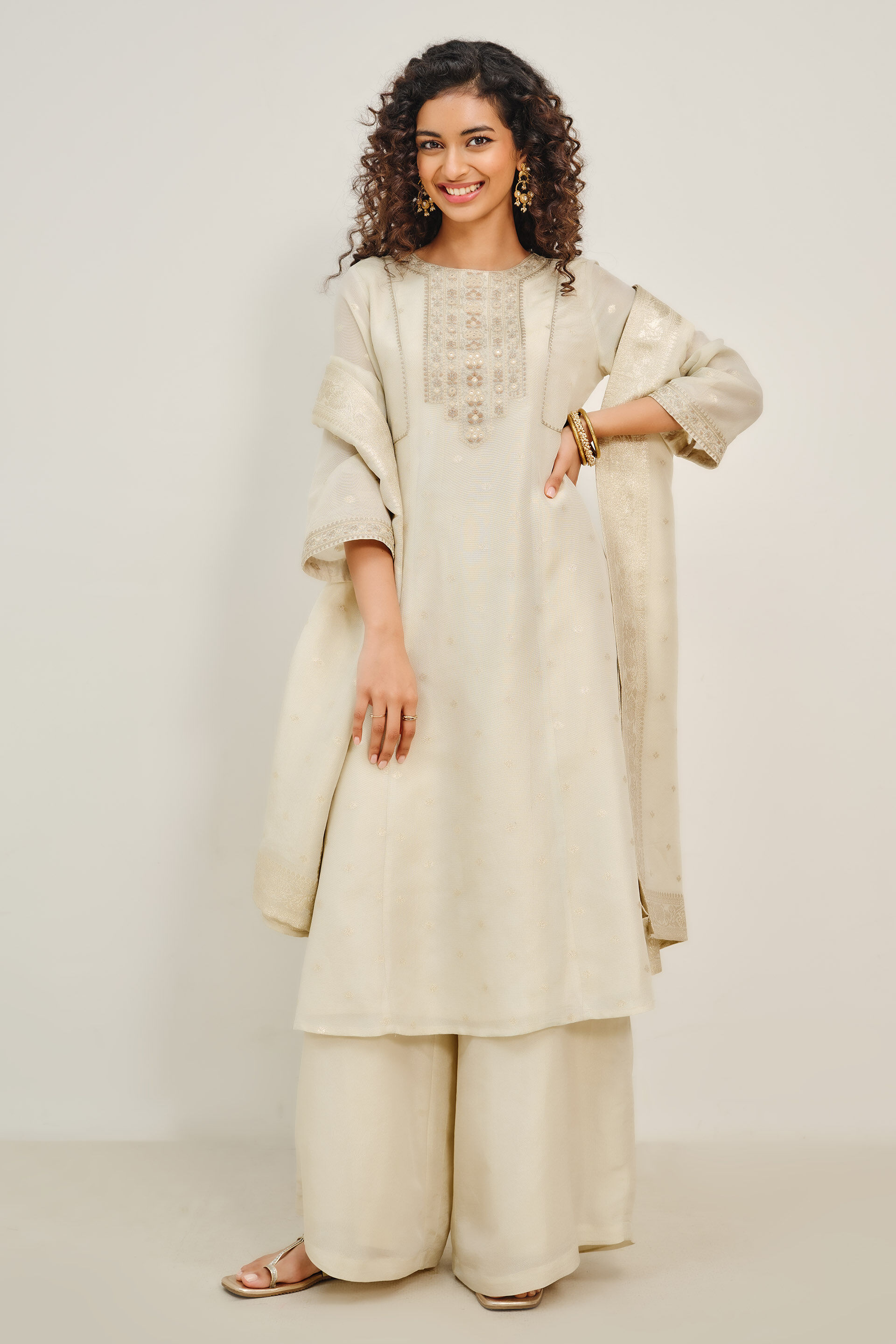 Graceful and timeless, this set pairs a textured long kurta with straight pants and a rich jacquard dupatta. The soft ivory tone and subtle weave lend a festive glow that feels equal parts elegant and easy.