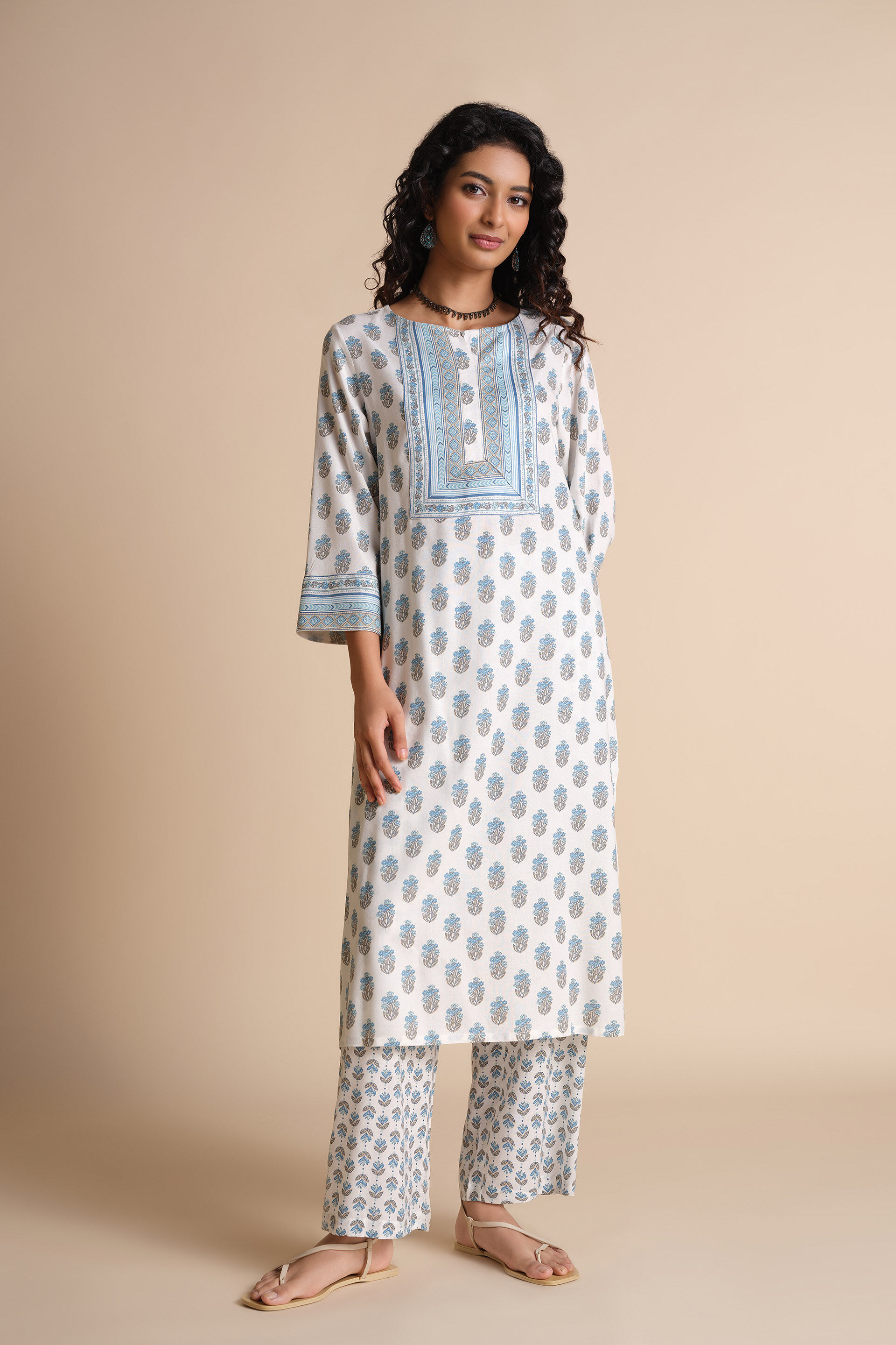 For days you're in the mood to keep it relaxed, go for this fuss-free and elegant kurta. It comes with nature-inspired prints, three-quarter sleeves & a round neckline. Featuring a straight-fit silhouette, this ensemble is crafted in soft & flowy modal fabric for ease & comfort. Pair it with silver bangles & trailing earrings to complete your look.