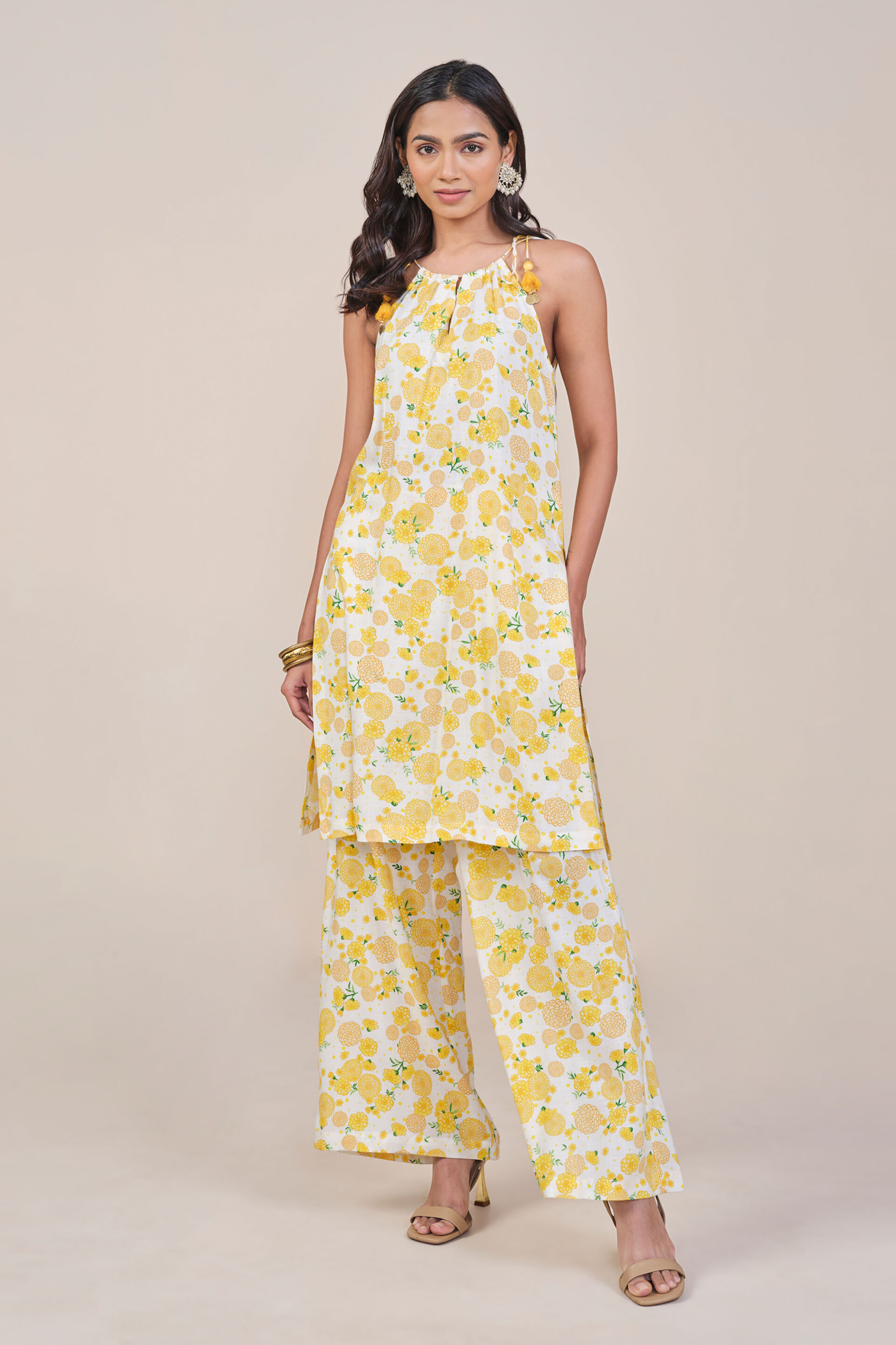 Featuring an elegant floral print all over, this breezy set features a sleeveless kurta and straight-fit bottoms. It comes with a flowy silhouette making it a easygoing pick for a hectic day at work.