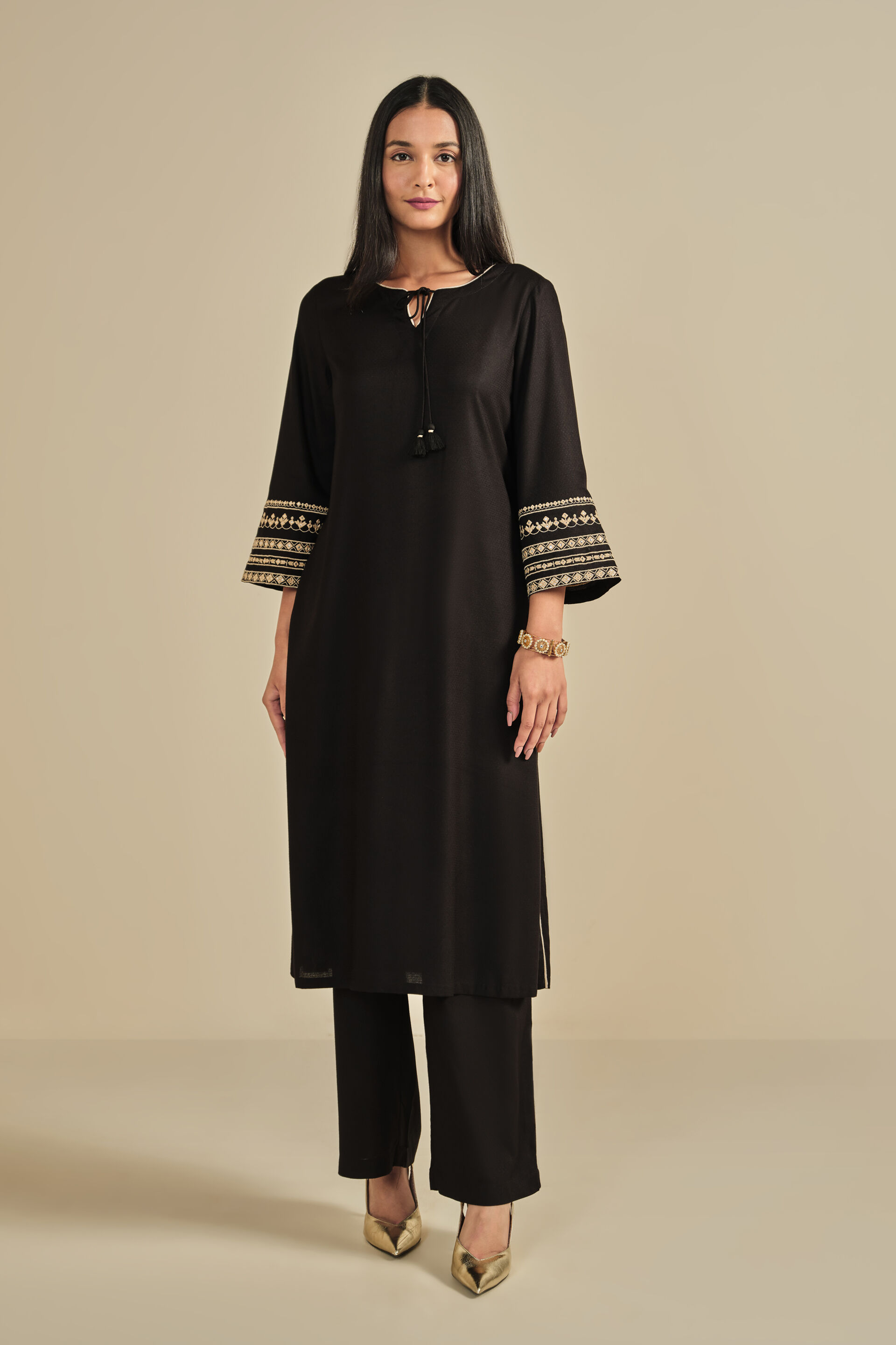 This essential kurta set is crafted from comfortable Rayon. The embroidered top has a round neckline and a regular fit, while the flared palazzo bottoms feature pockets on either side.