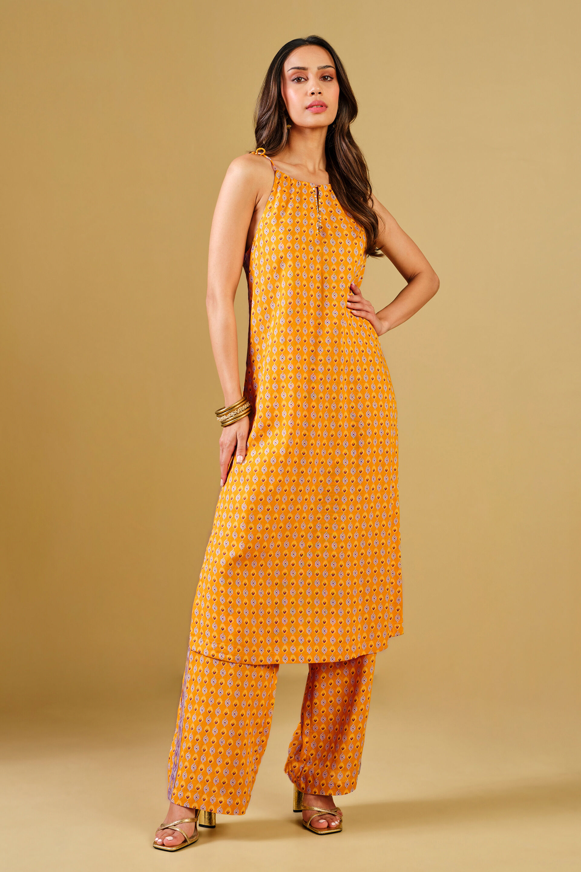 Bring home the bright summer vibes with this 2 piece kurta set. Featuring tassel details with shoulder tie-ups on a straight-fit kurta and wide-leg pants to match, this set is crafted using a blend of rayon, cotton, and flax.