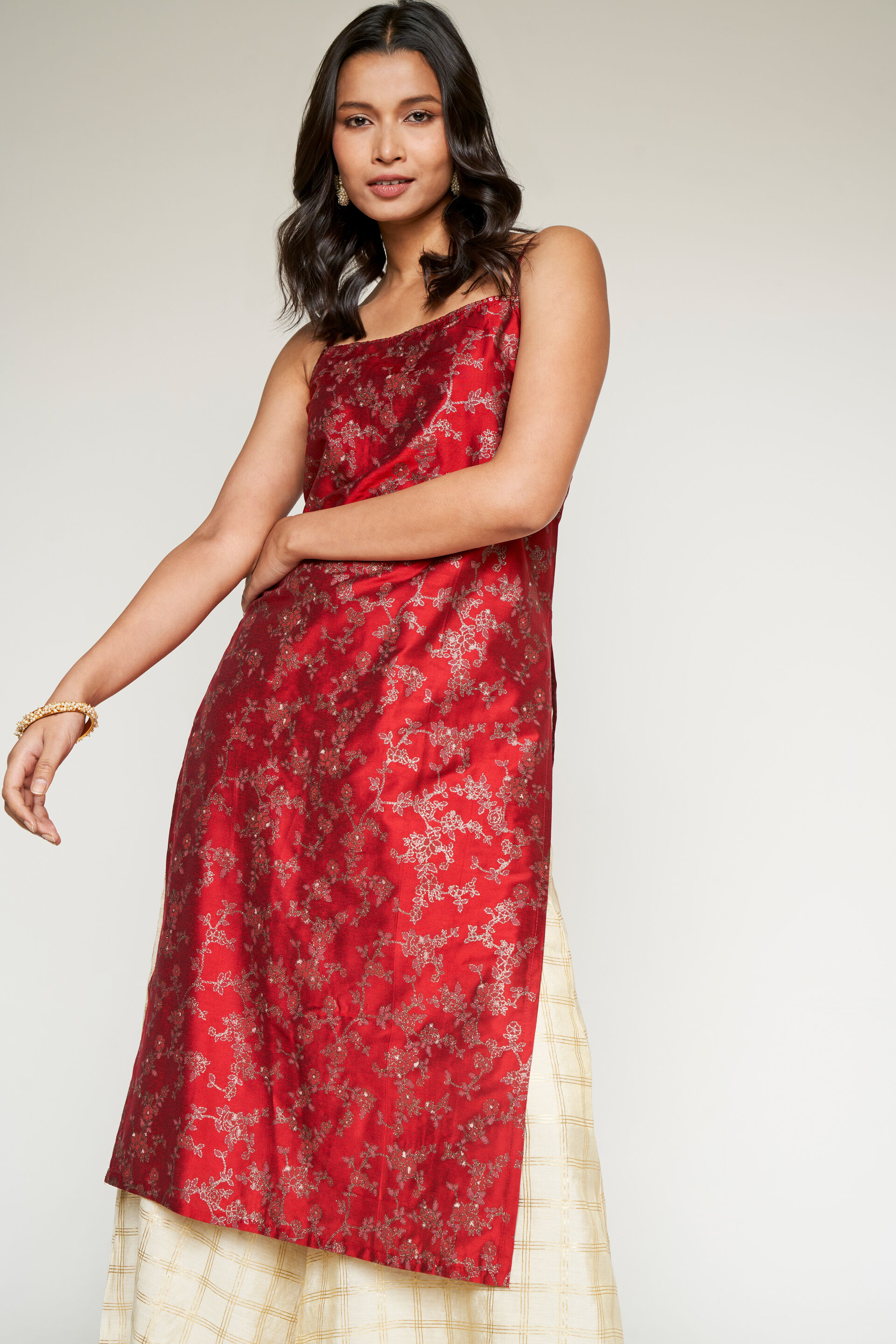 Upgrade your wedding wear wardrobe with this gorgeous kurta set for women from Global Desi. Crafted from the plush shantoon fabric for continuous comfort, this set comprises a straight-fit kurta with spaghetti straps, a floral motif with gold details, print all over and a beige palazzo with gold chequered weave showcasing an elasticated waistband with a side zipper for a better fit. Elevate this ensemble with ethnic dangling earrings and juttis or kolhapuris. Throw in a contrasting dupatta or shrug to amplify the elegance. The model is wearing size: Top - 'Small'/10 & Trouser - 28