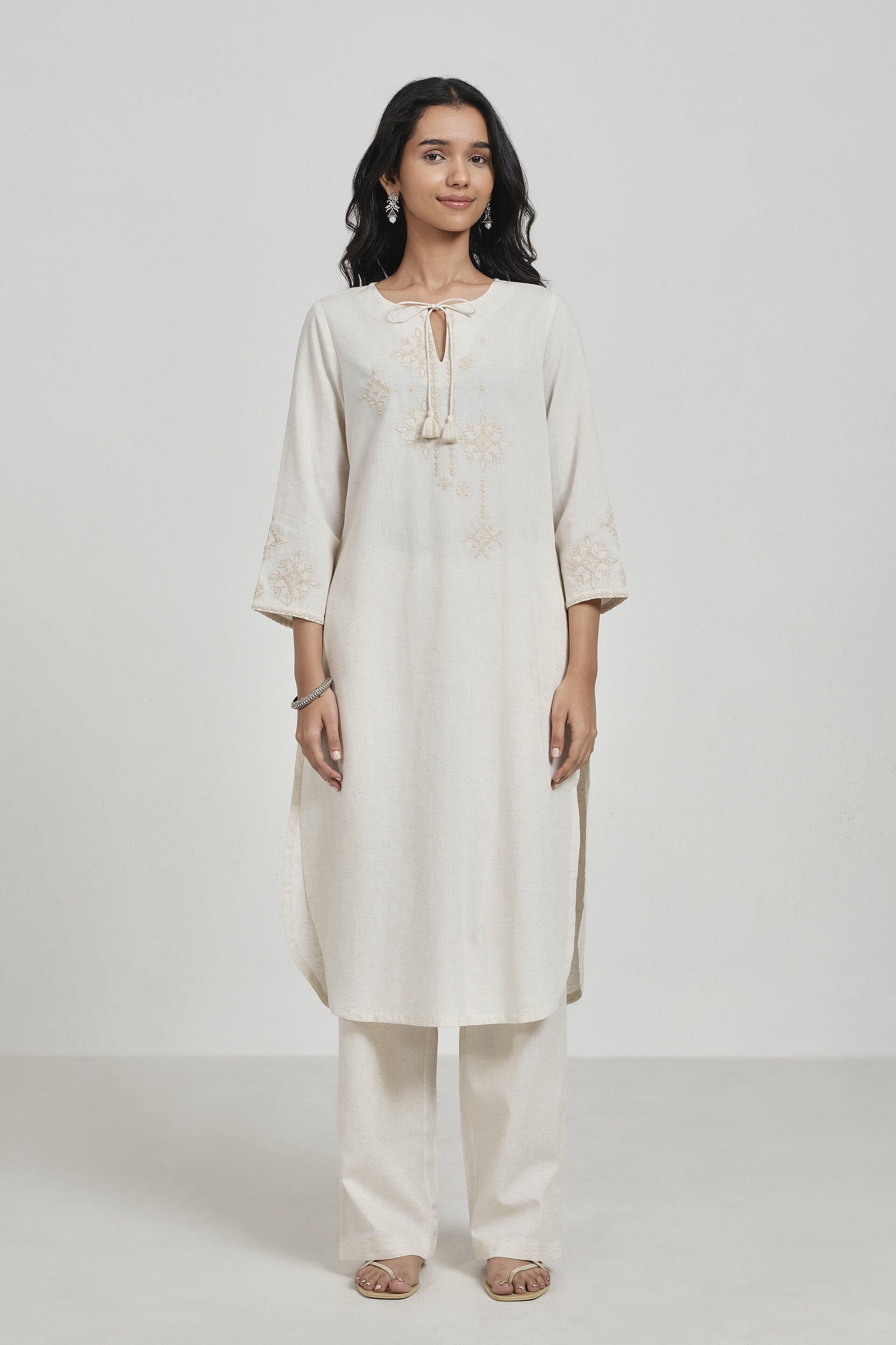 A two piece set in a natural tone that comes with an embroidered straight kurta featuring a round neckline with a front tie-up detail and three-quarter sleeves, paired with straight pants.