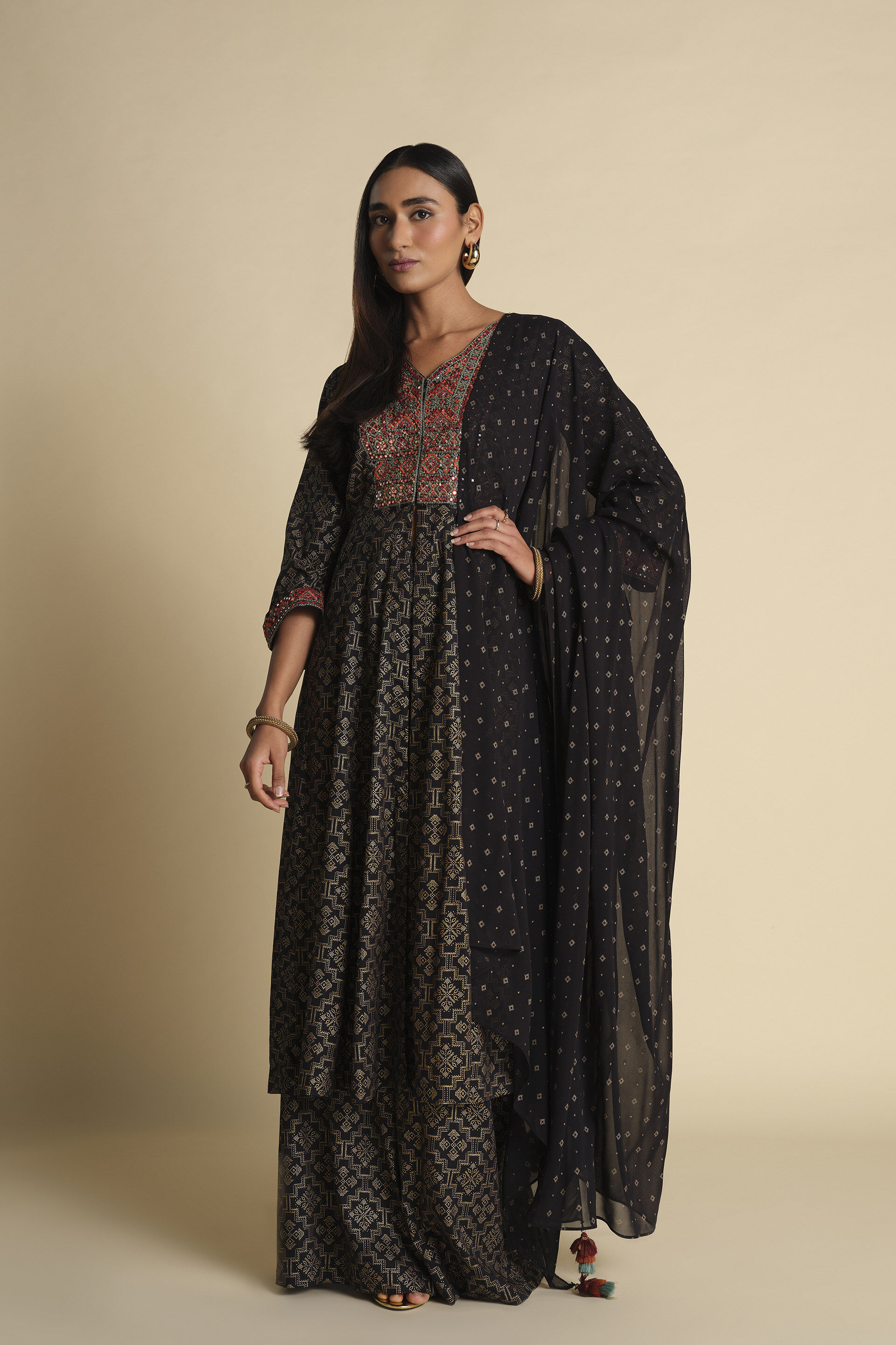 Celebrate in style with this elegant 3-piece set that features foil prints all-over. It is the perfect occasion wear with a heavily embellished kurta, paired with flared pants and a dupatta adorned with heavy tassels. An eclectic India-inspired set, it is perfect for weddings, festive occasions, and cocktail events.