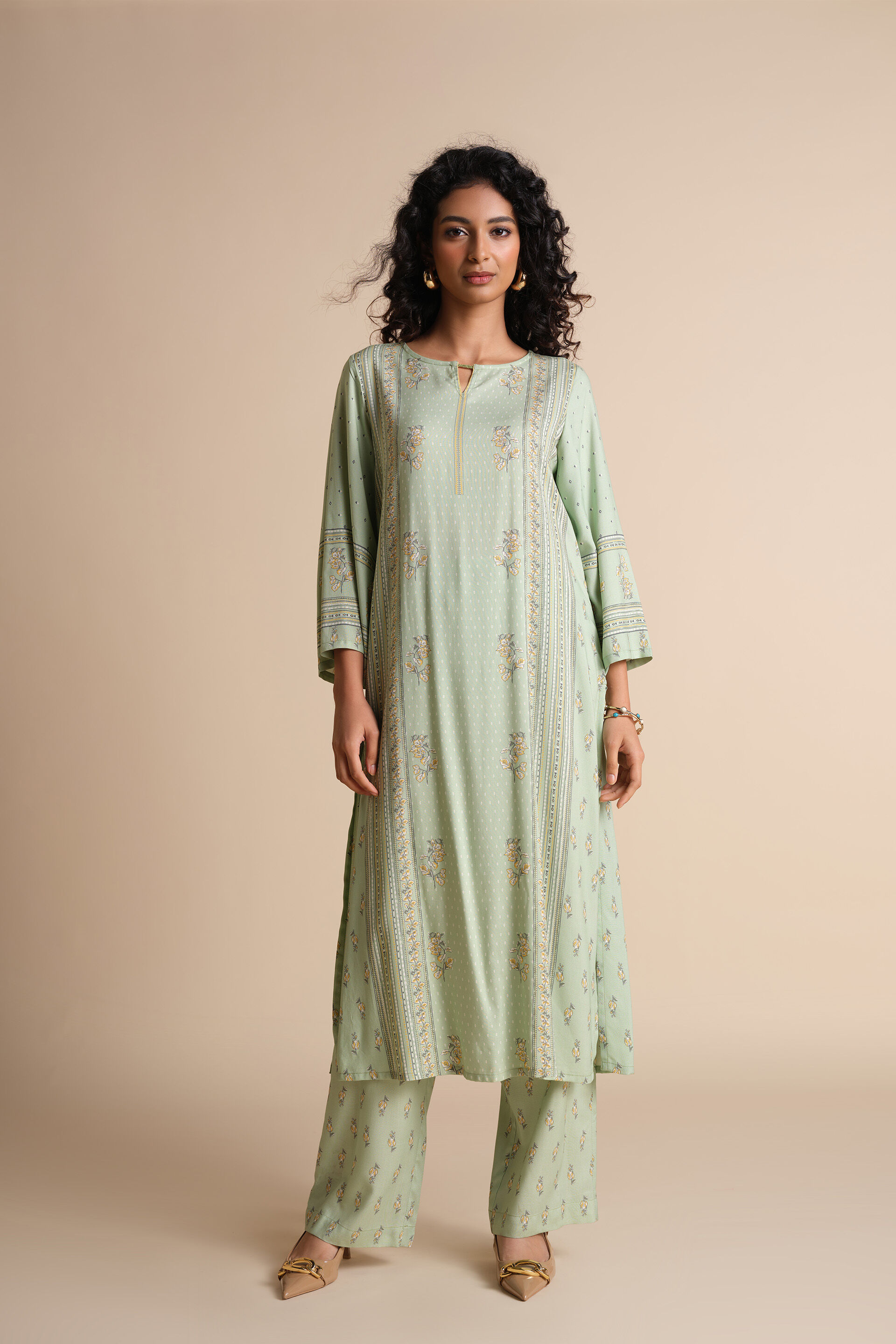 Breezy & elegant, this kurta set is perfect for daytime. Featuring India-inspired prints, this kurta set is crafted in soft & breathable viscose fabric. With three-quarter bell sleeves, round neckline and pockets, this is the perfect summer ensemble that offers ease and comfort all-day long. Pair it with embroidered sliders & threadwork earrings to keep it light and stylish.