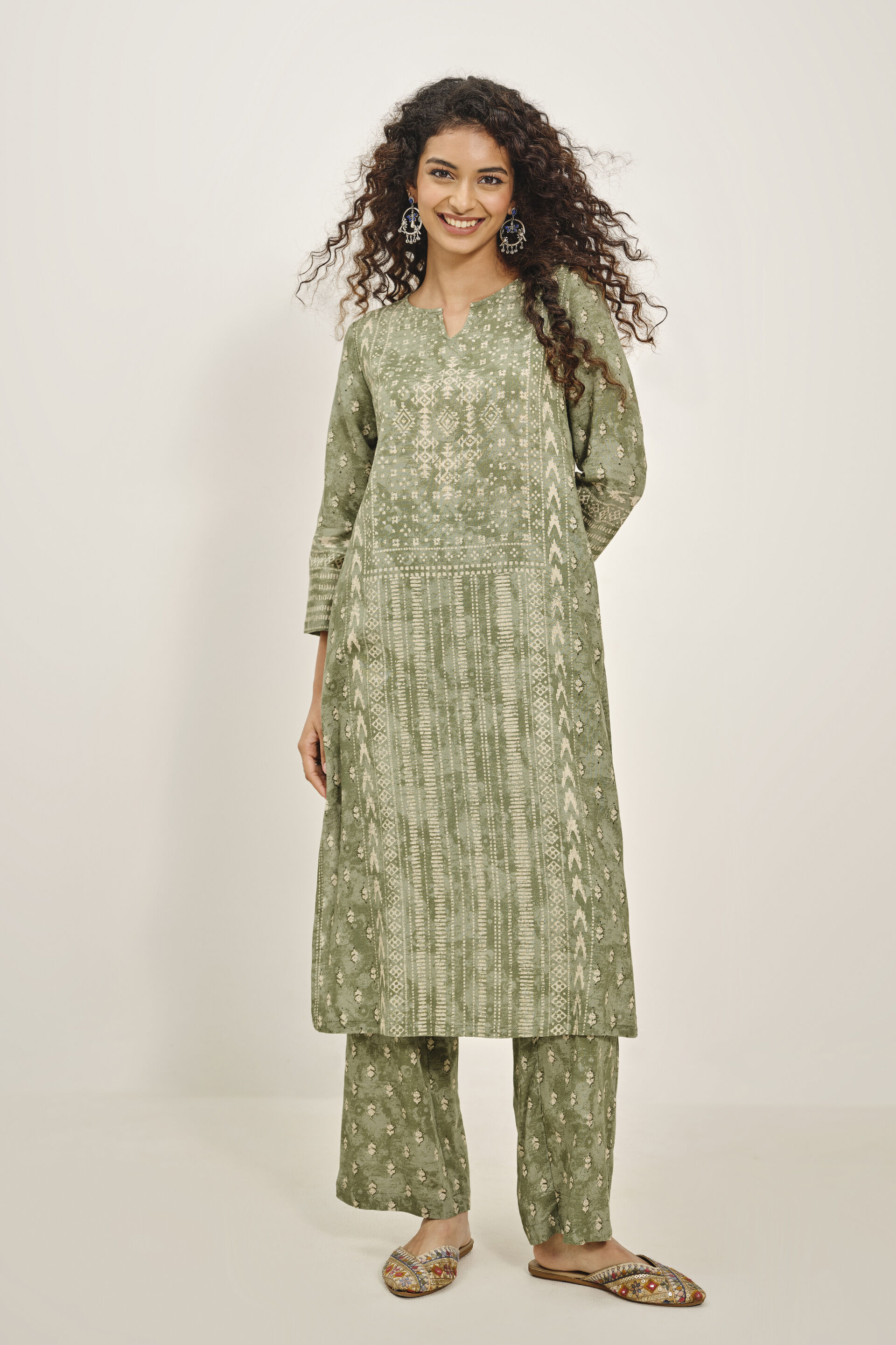 A sage green set that binds together comfort and grace like a sutra. Printed on linen-blend fabric, with three-quarter sleeves and a straight silhouette and straight pants, it’s perfect for casual yet elevated dressing.