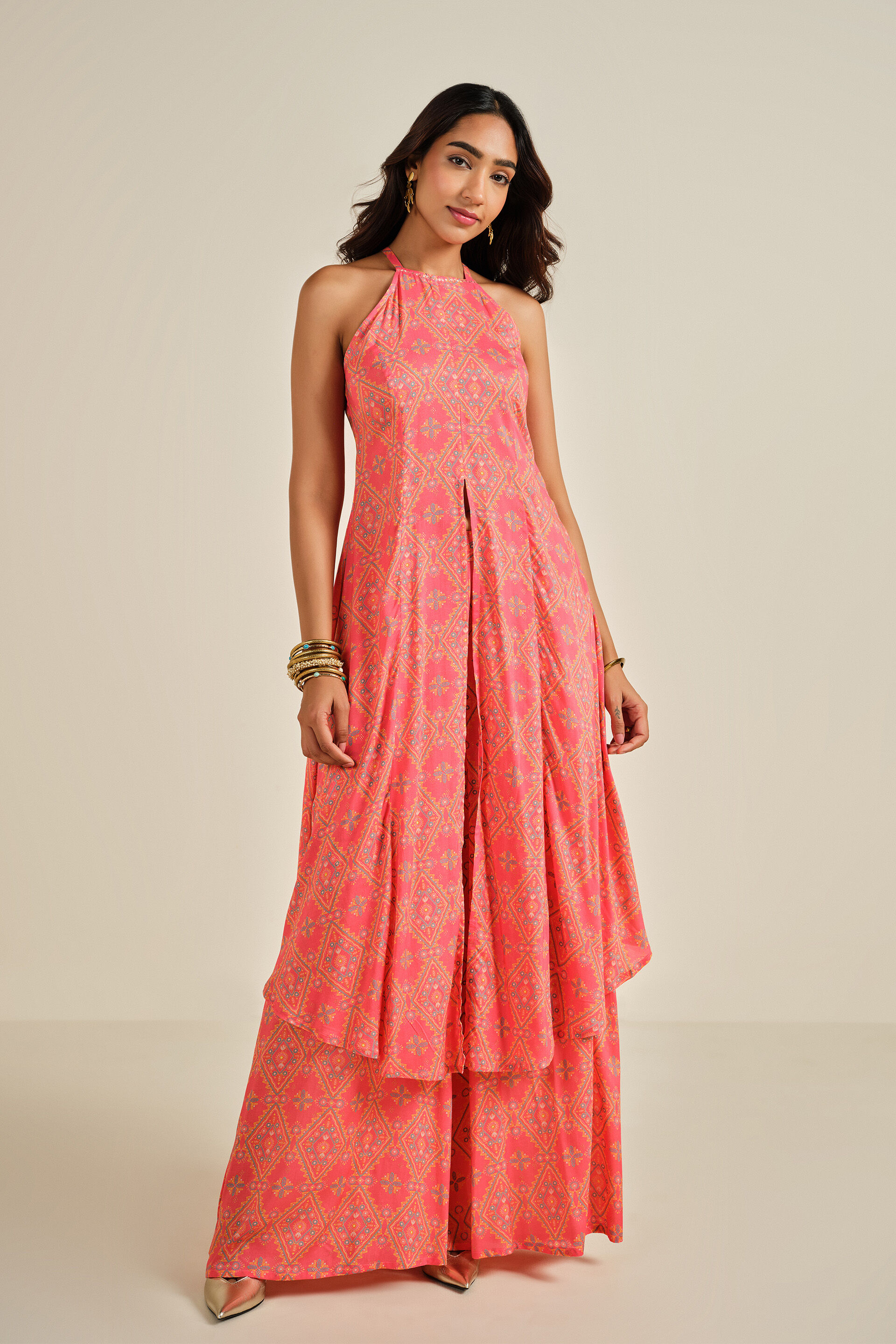Adding a rare shade of coral to your wardrobe, our Samundar Kurta Set features a straight neck and is sleeveless. It leaves room for styling and features India-inspired prints, making it a perfect everyday wear.
