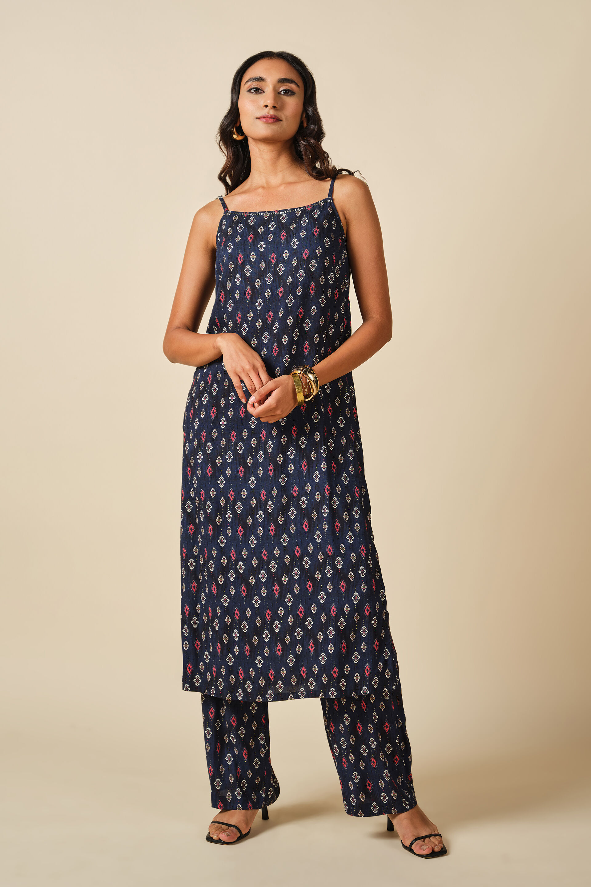 Step out in style with this kurta featuring Indian-inspired prints. Paired with a flared bottom, this two-piece set is crafted in a soft & flowy viscose fabric to offer ease of movement all day long. Style it with dainty jewellery for the perfect summer look or chunky earrings and bangles for festivities.