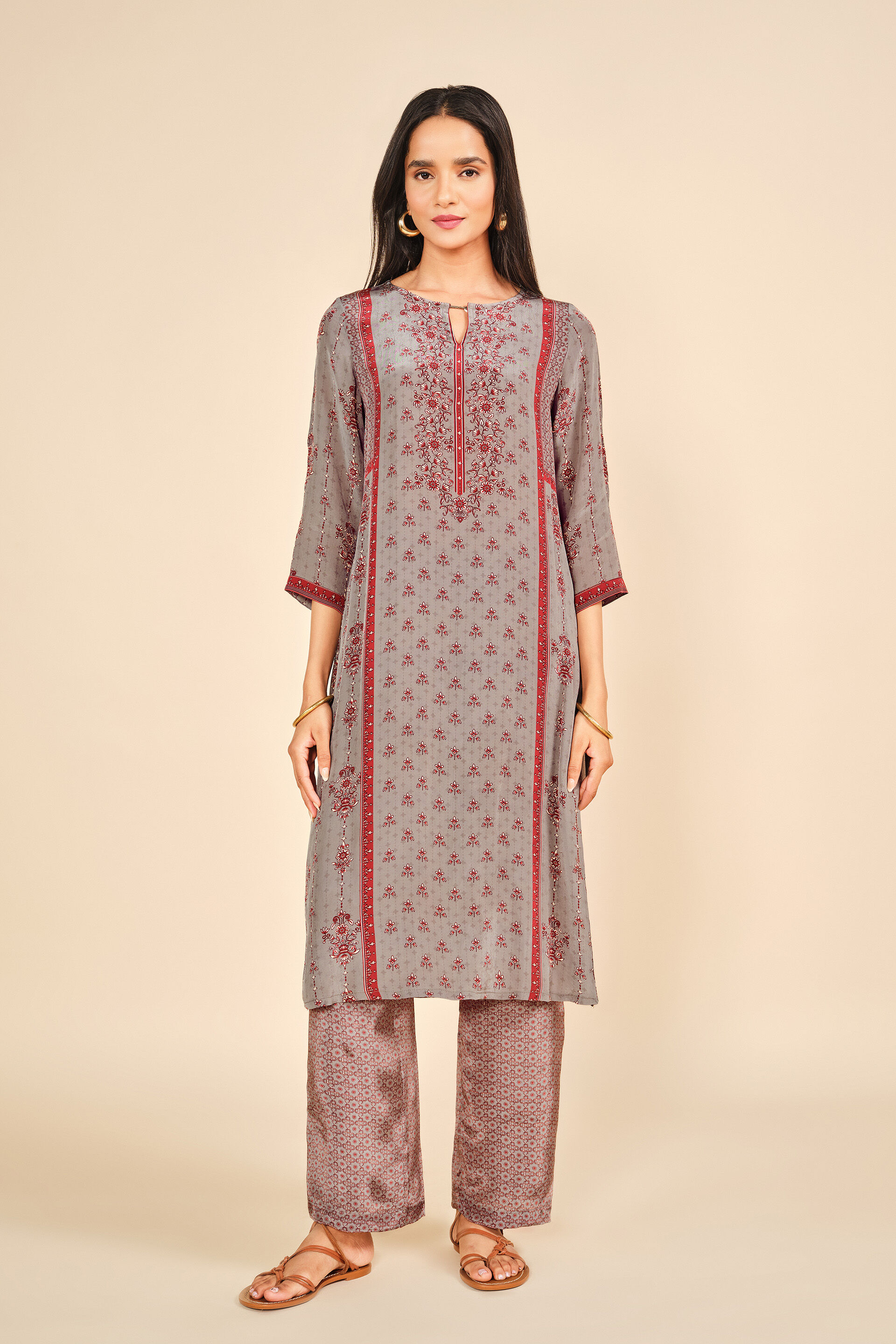 Make everyday stylish with this elegant kurta set! Feauring India-inspired prints all over, this ensemble comes with tassel and coin details on the neckline. Crafted using soft eco-friendly viscose fabric, this kurta comes with three-quarter sleeves & wide-legged pants. Style your look with silver earrings, making this outfit perfect for casual outings and day events.