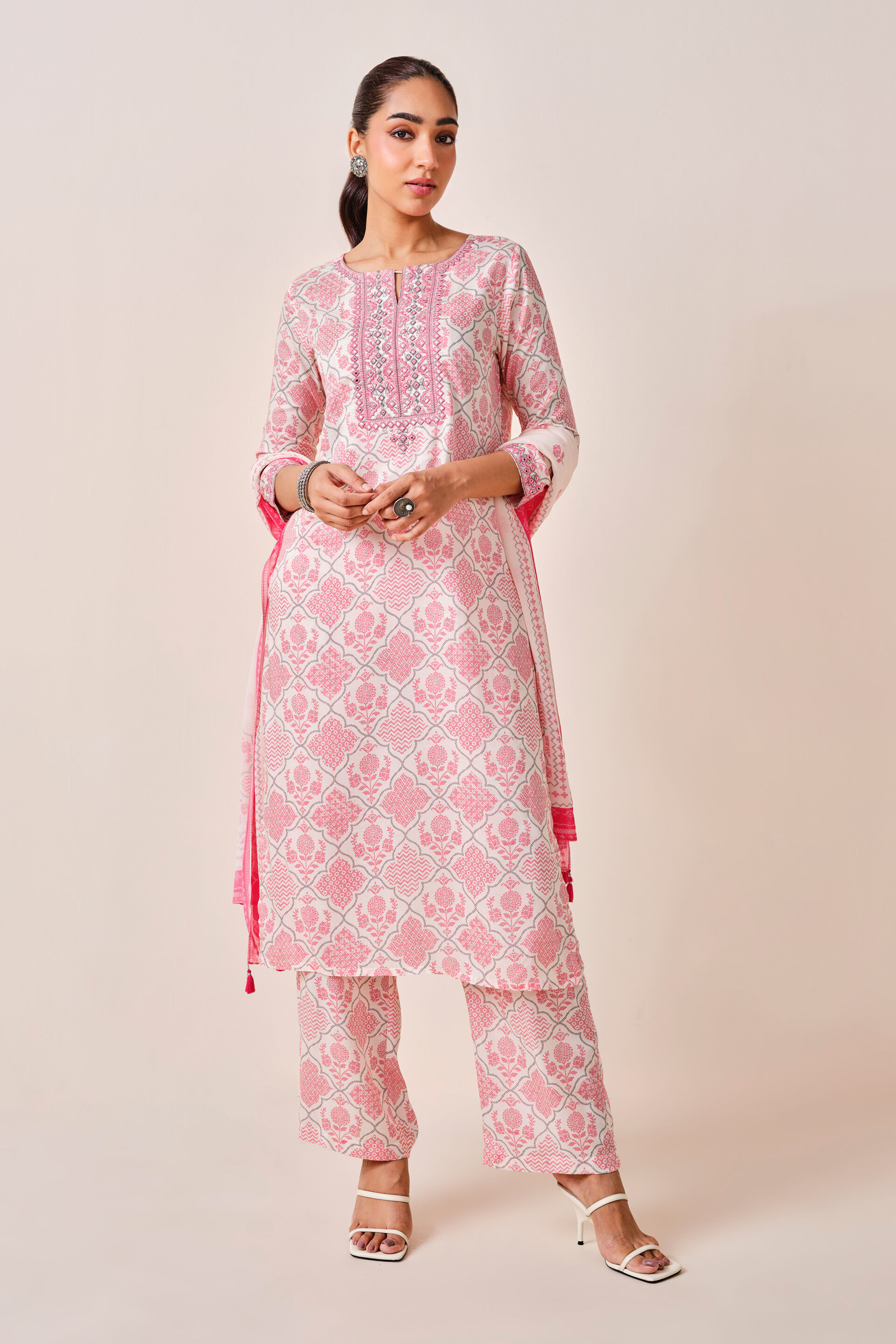 Lightweight and easy to wear, this kurta set is crafted with 100% viscose featuring mirror and zari embroidery on the neckline and comes with two pockets. Pair it with silver jhumkas for a finished look.