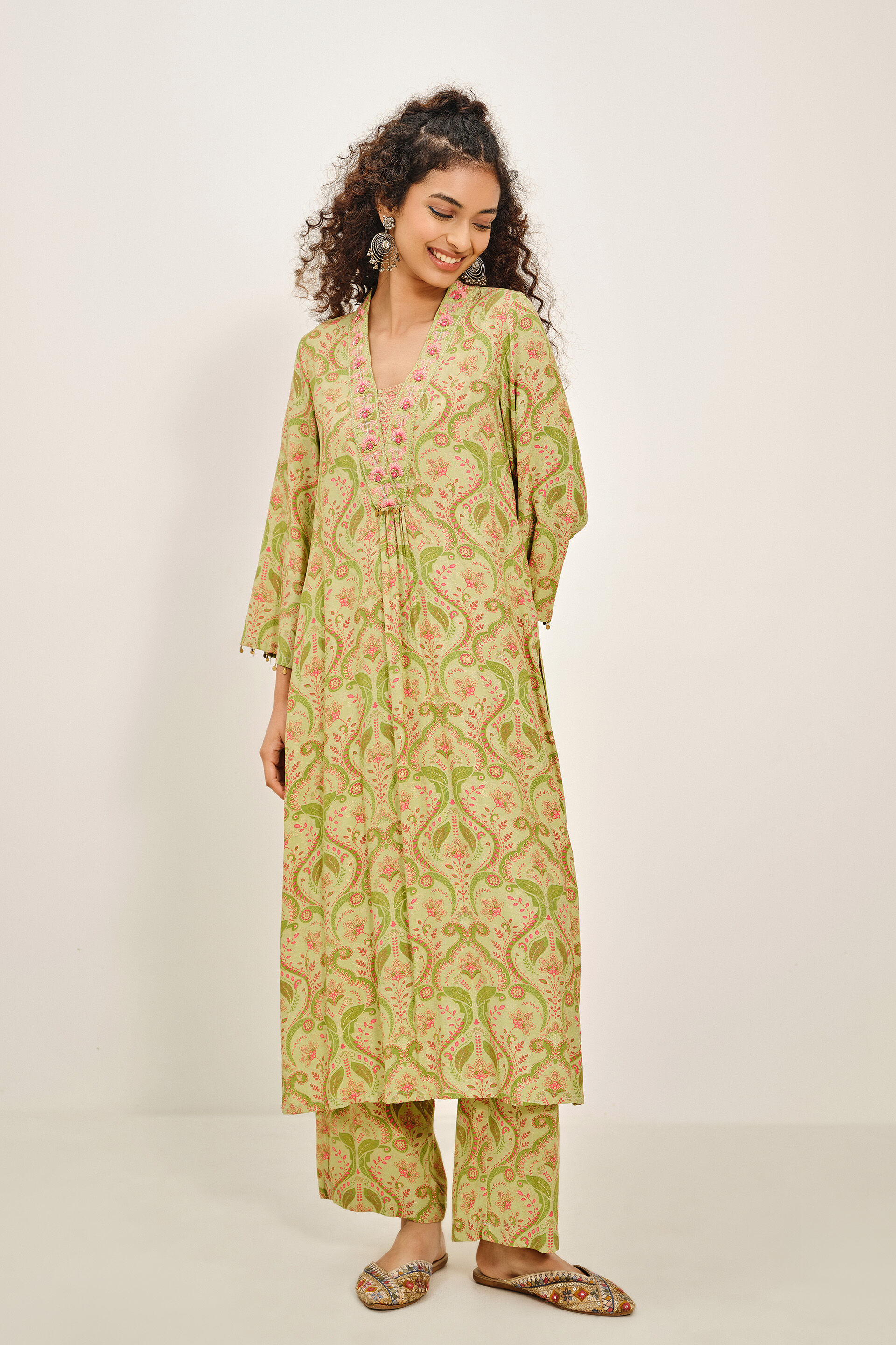 This set pairs an A-line printed kurta with matching pants, all in a calming sage green tone. With its graceful V-neck and fluid crepe fabric, it brings an understated radiance to your festive evenings.