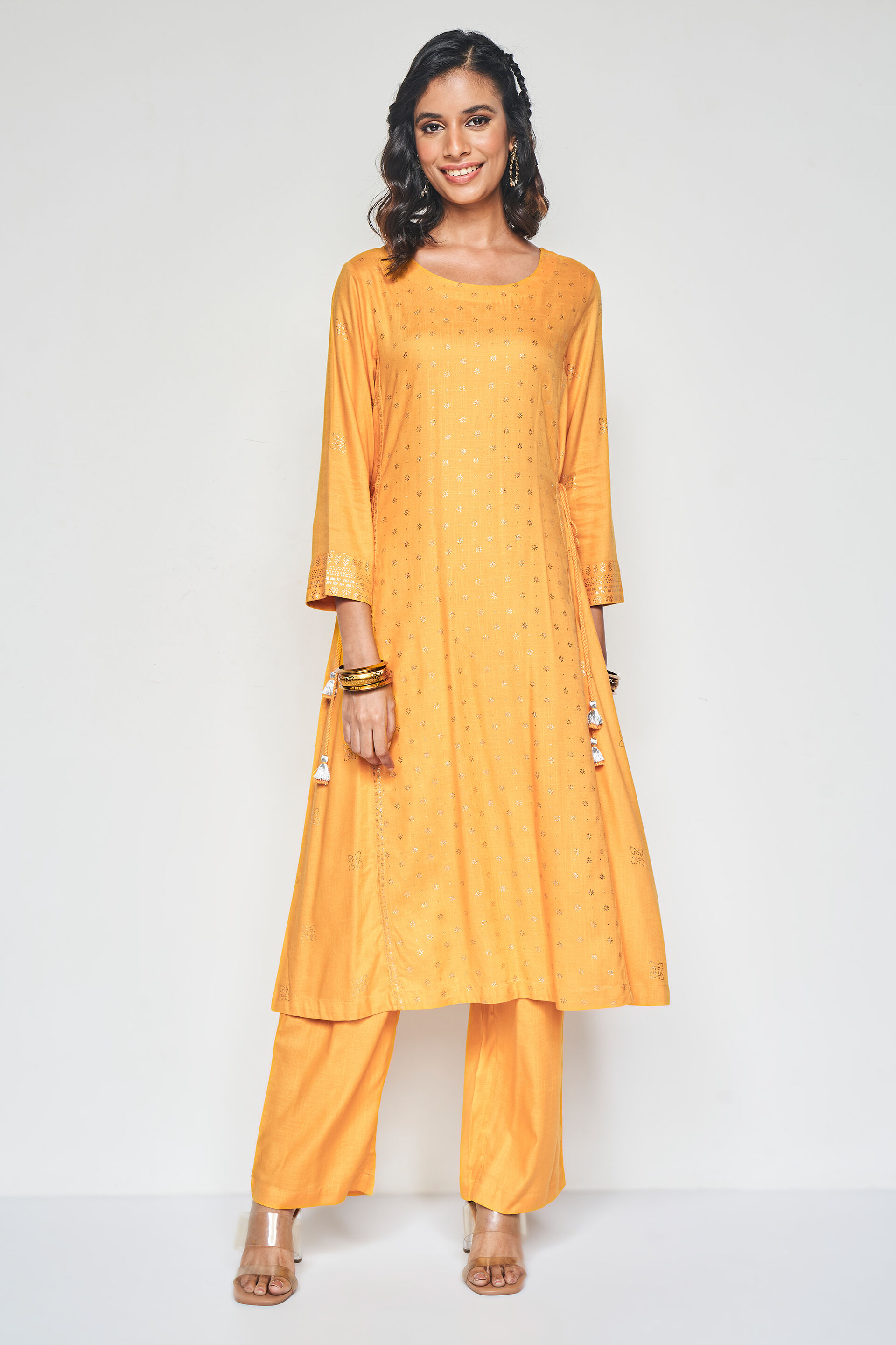 Crafted using a breathable fabric, this happy-hued set features relaxed bottoms and a straight fit kurta with a sublte foil print all over.