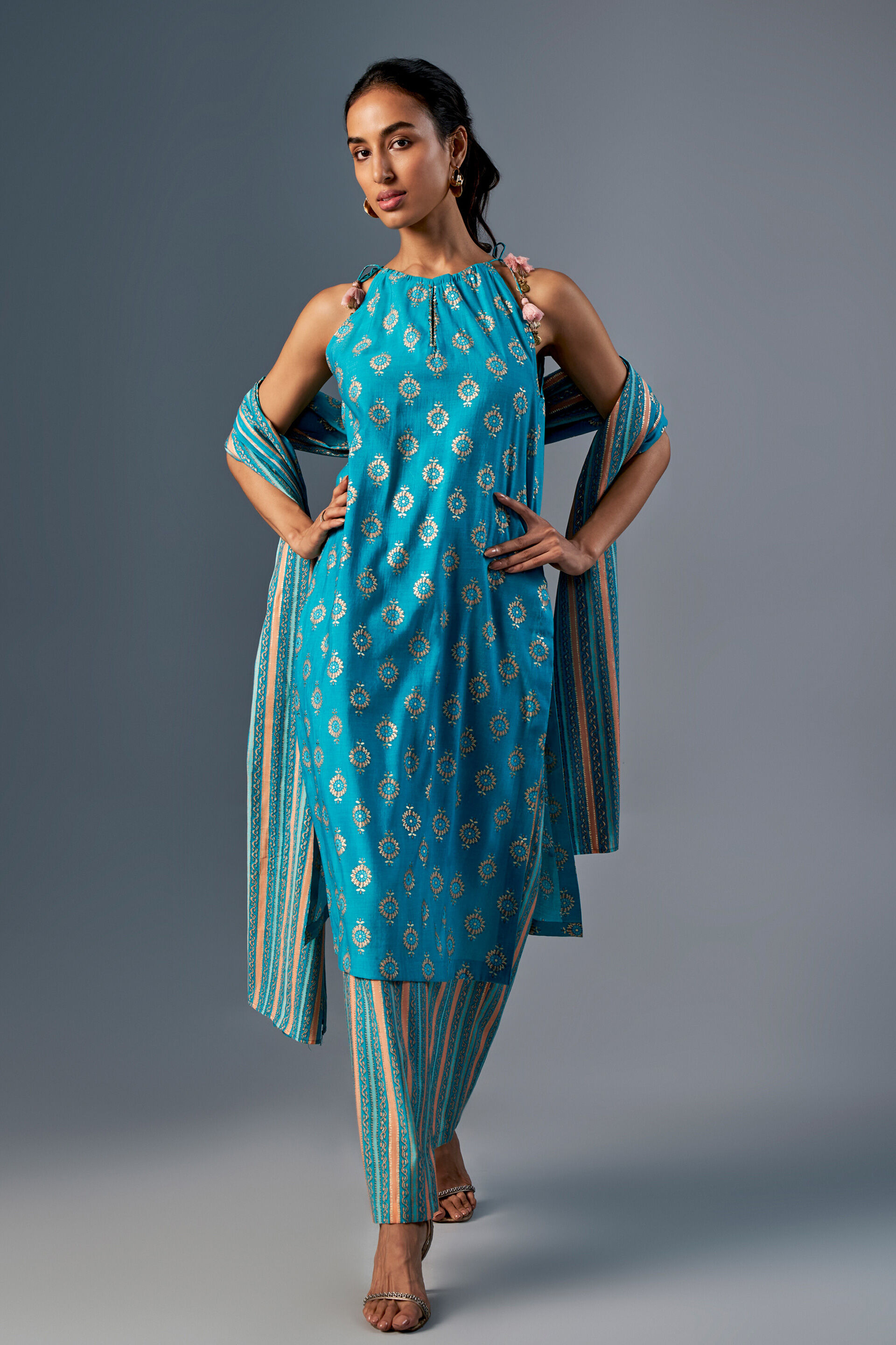 One of our bestselling silhouettes, this set is a fun choice for any occasion where you want to amp up your style. Complete with adjustable straps, playful latkan details and gold print detail along the front, this set is definitely going to become a fast favourite.