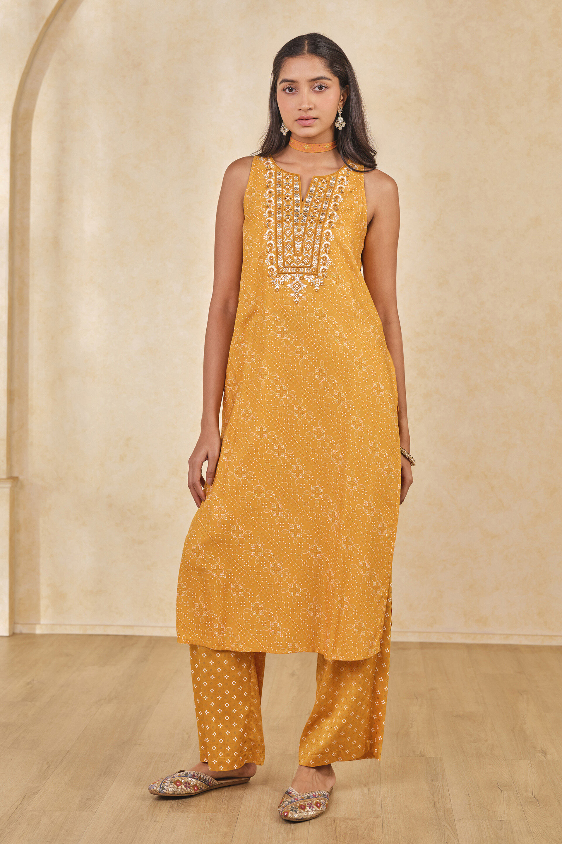 Get ready to shine bright with this yellow kurta set for your festive gatherings! Crafted from soft eco-friendly viscose fabric, it ensures comfort all day long. The kurta showcases an India-inspired print and features stunning mirror, thread, and zari embroidery on the front. Paired with straight-printed pants to complete the look.