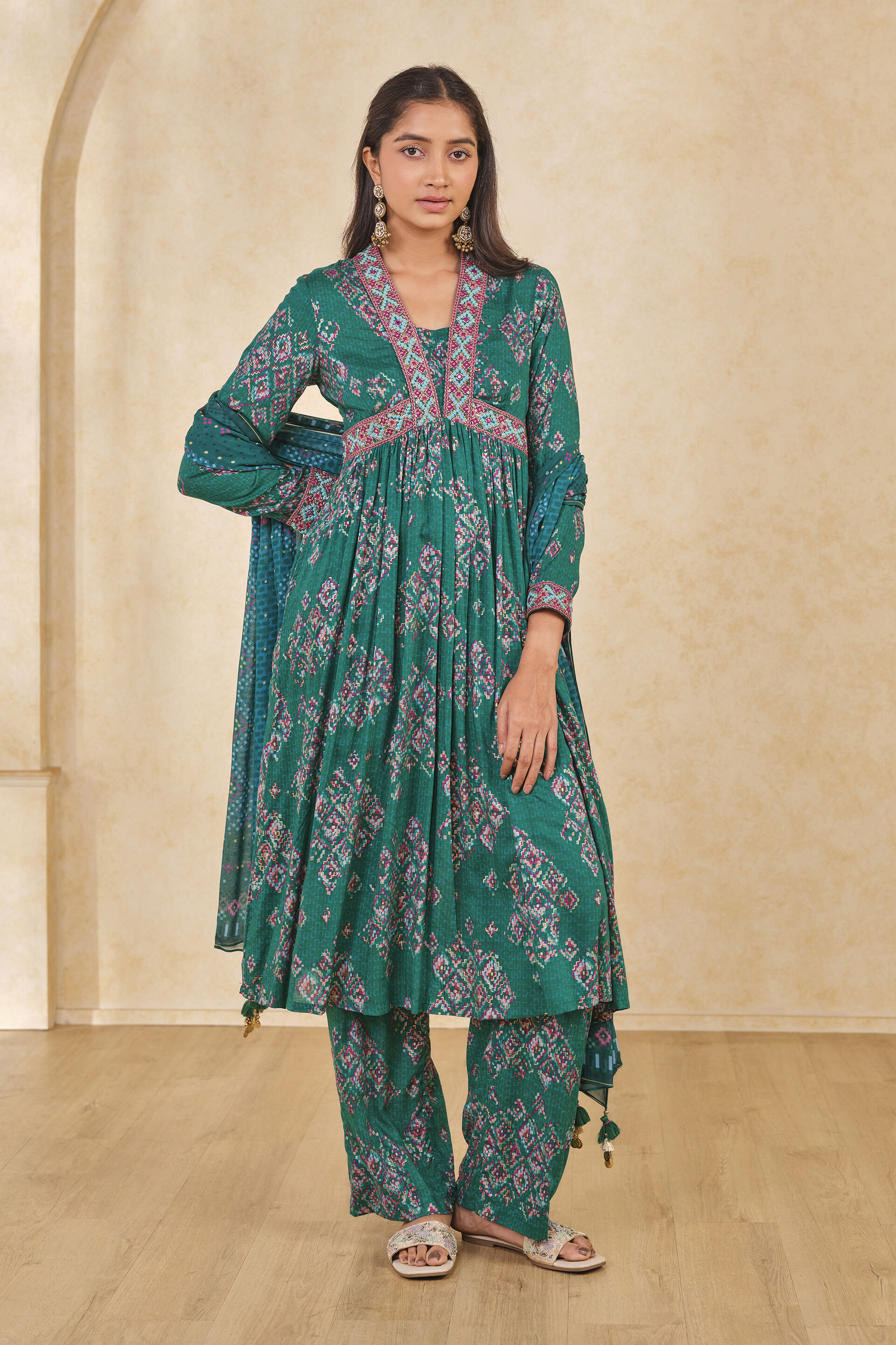 Elevate your occasion with this gorgeous 3-piece geometric print set in a rich green hue. The embroidery along the neck, sleeves, and waist creates a flattering fit. The pants feature a flared fit. Crafted from eco-friendly viscose fabric, this set ensures all-day comfort.