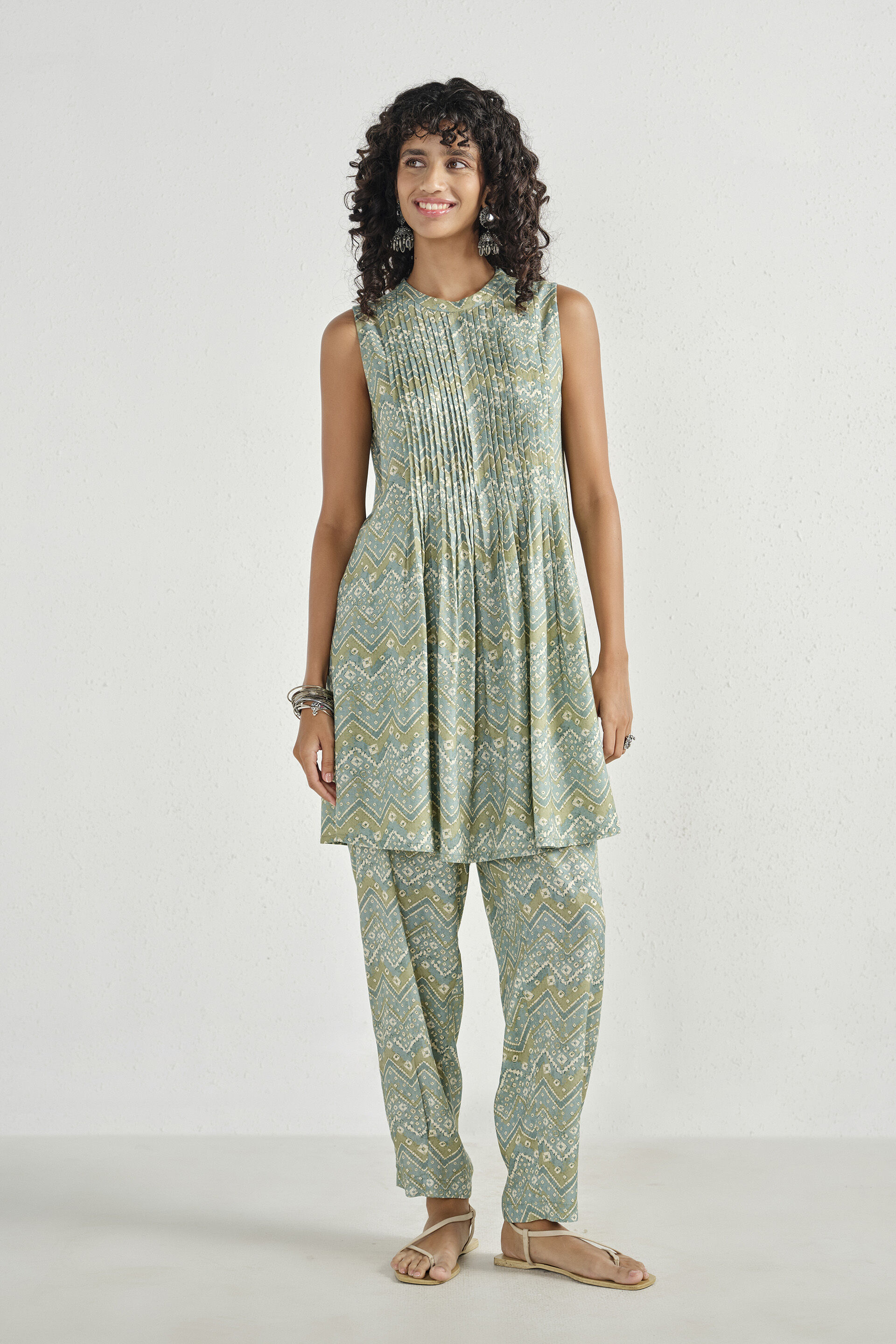 A two piece set that comes with a teal sleeveless A-line short kurta featuring a round neckline with back slit and button detail, paired with straight slip-on pants.
