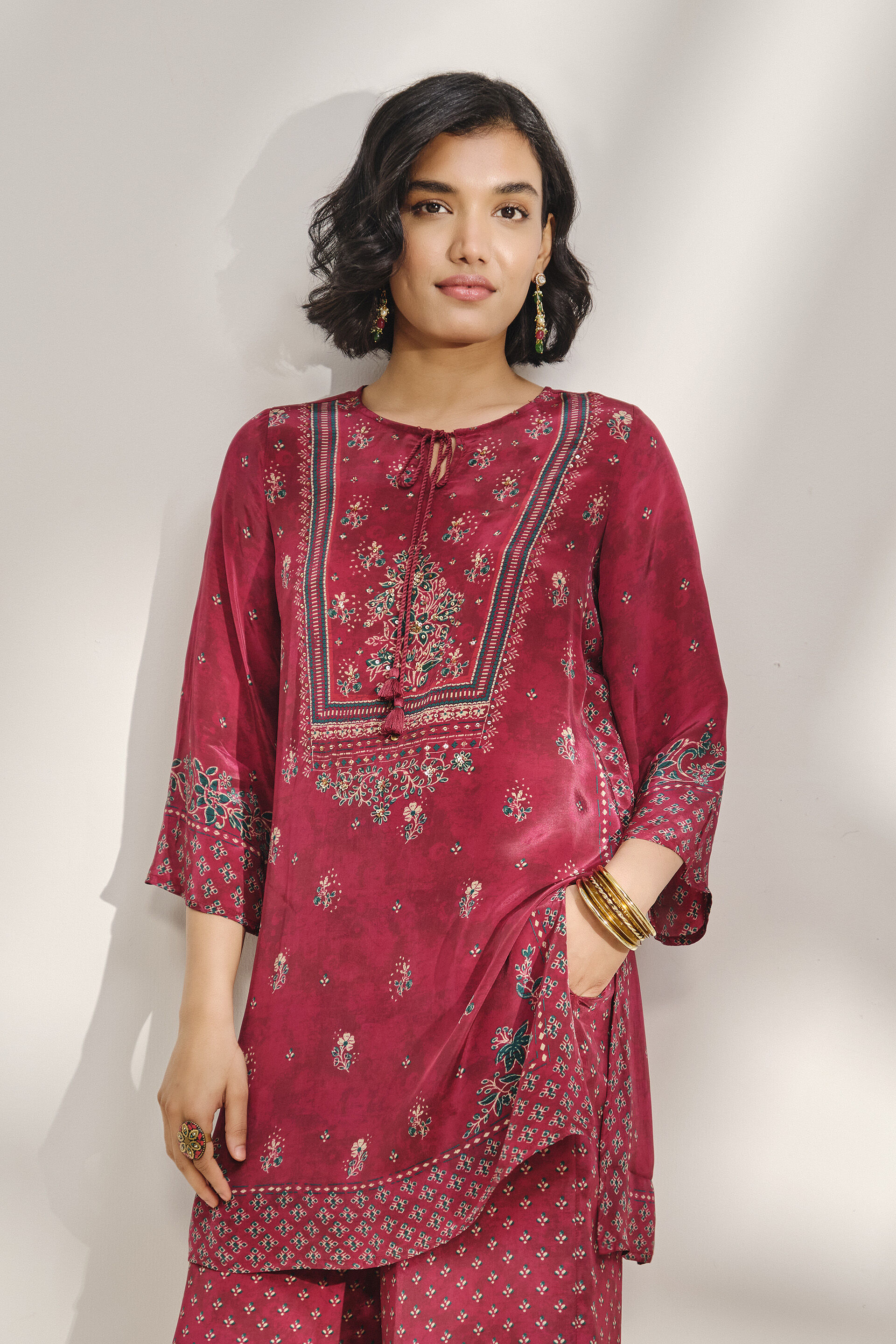 A melody in motion - this set features a printed crepe short kurta and matching straight pants. The print adds that festive glimmer, making it your pick for evening plans that flow from chai to chitchat to dance floor.