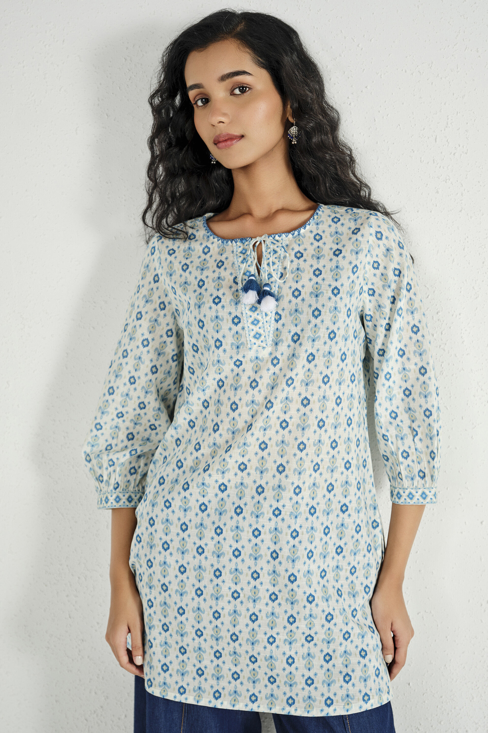 A printed white slip-in tunic designed with a round neckline and front-tie detail, three-quarter cuffed sleeves, a straight silhouette, and a mid-thigh length.