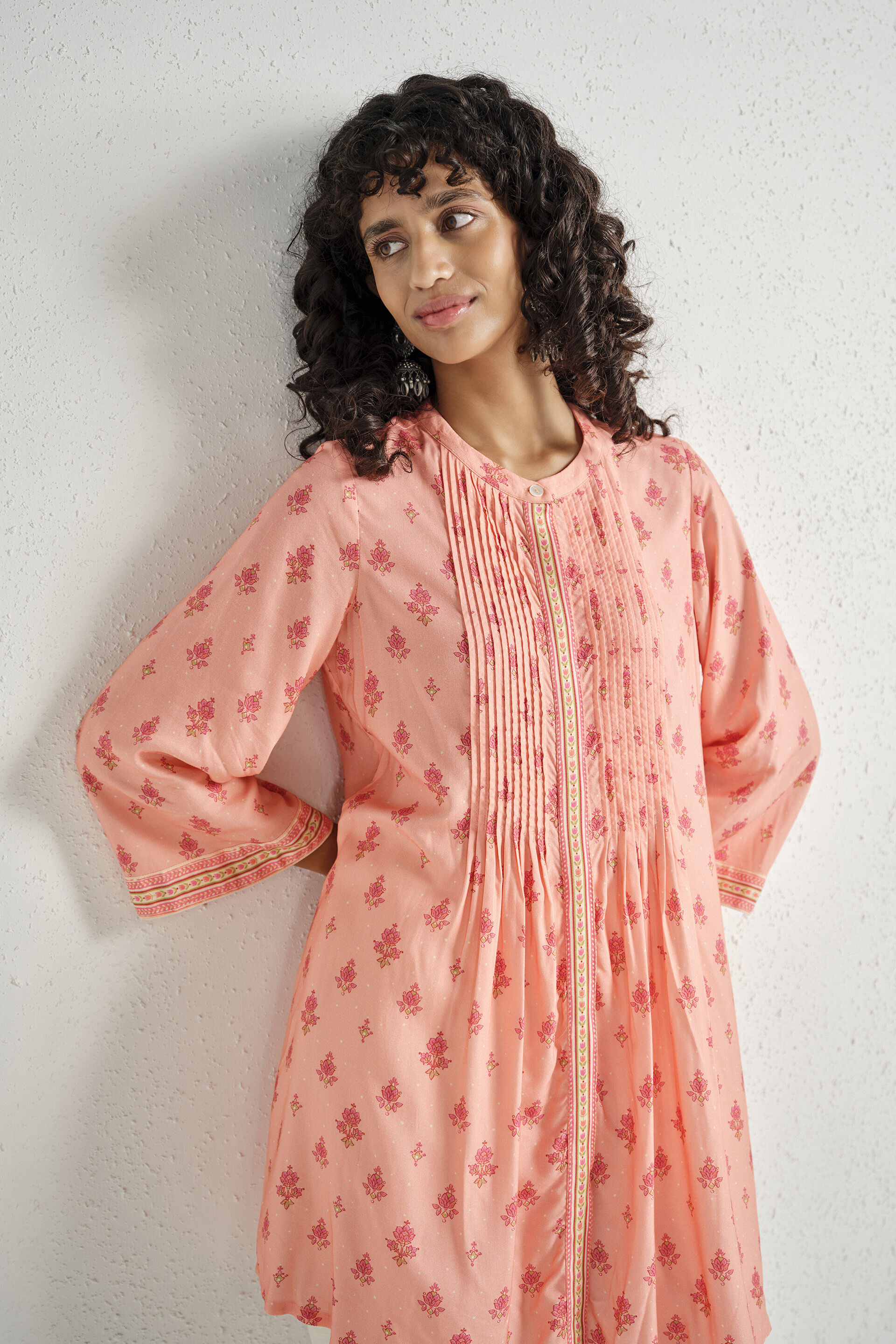 A pleated pink printed tunic featuring a band collar with front placket, three-quarter sleeves, mid-thigh length, straight silhouette, and button-up closure.