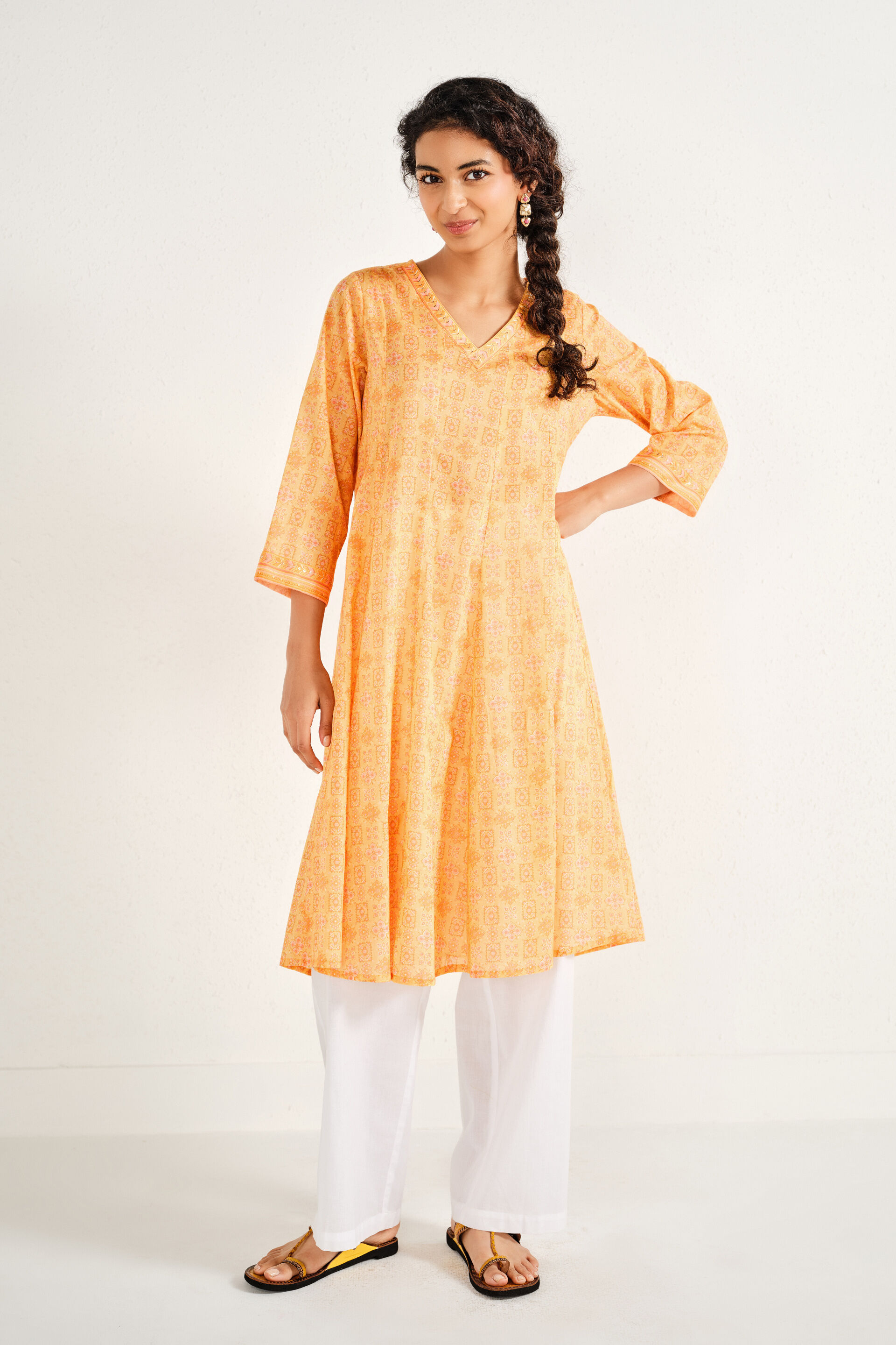 A yellow A-line kurta in pure cotton with a V-neck, three-quarter sleeves, and mid-calf length.
