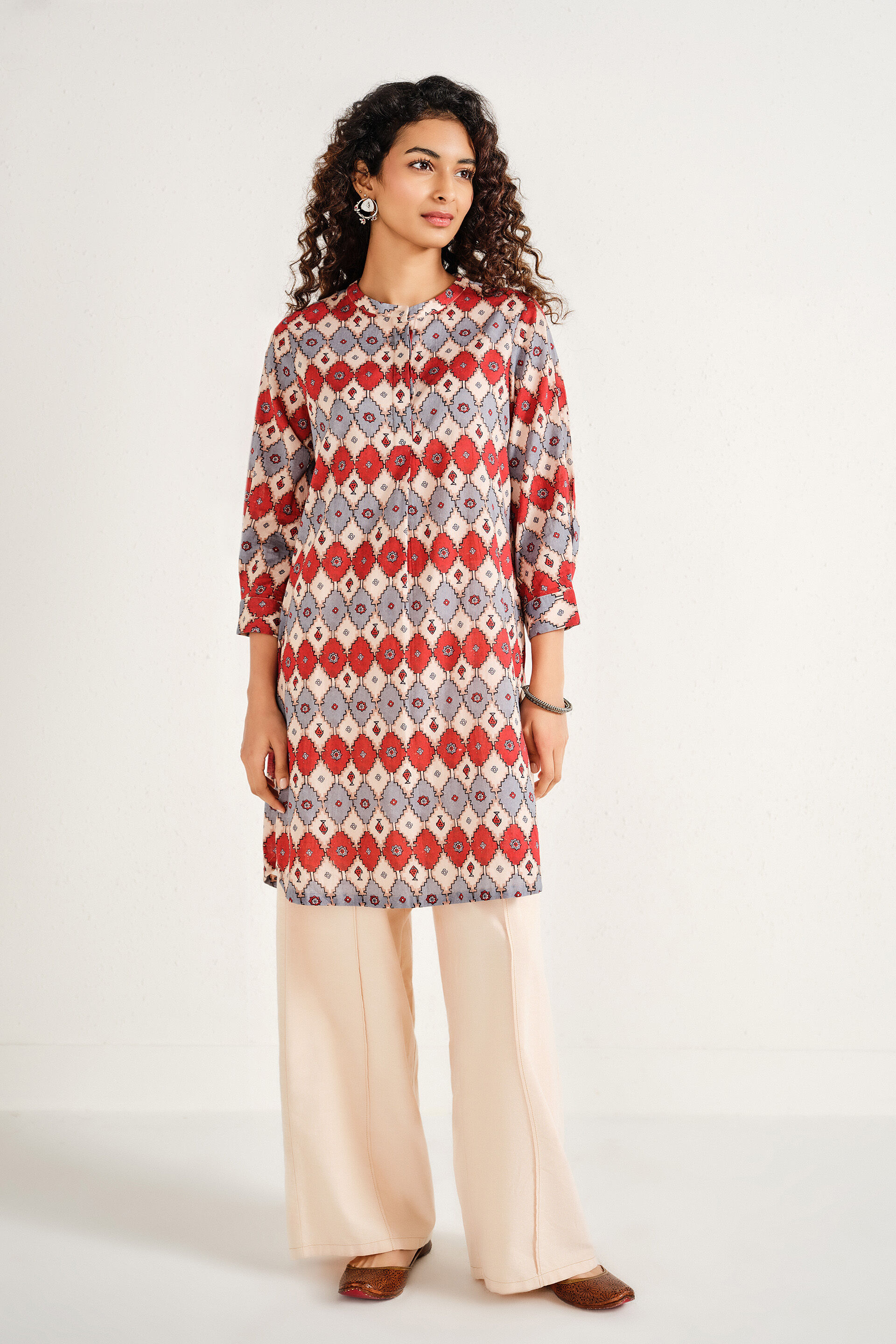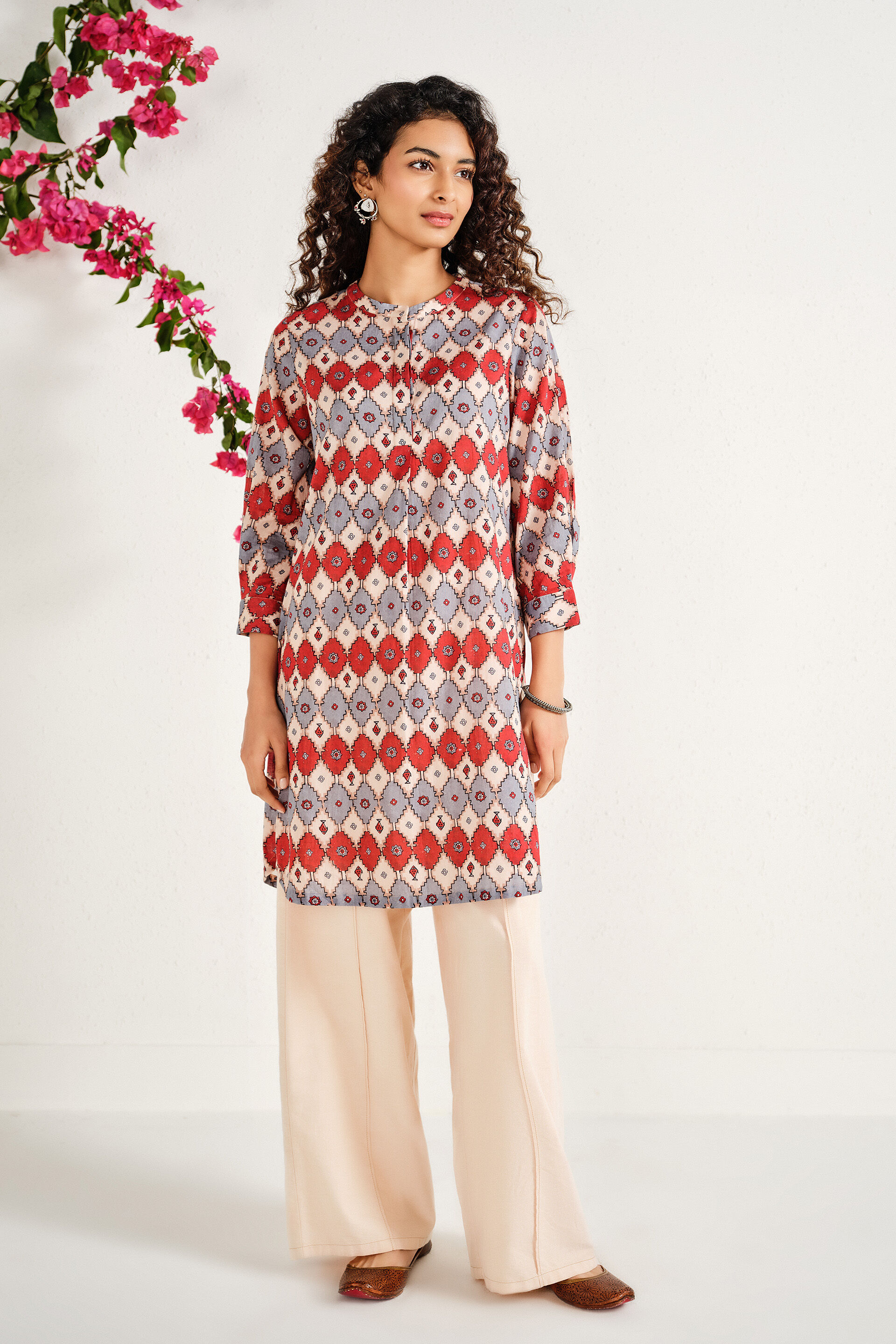 A straight tunic in pure cotton featuring a round neckline with concealed placket, rolled three-quarter sleeves, and a mid-calf length.