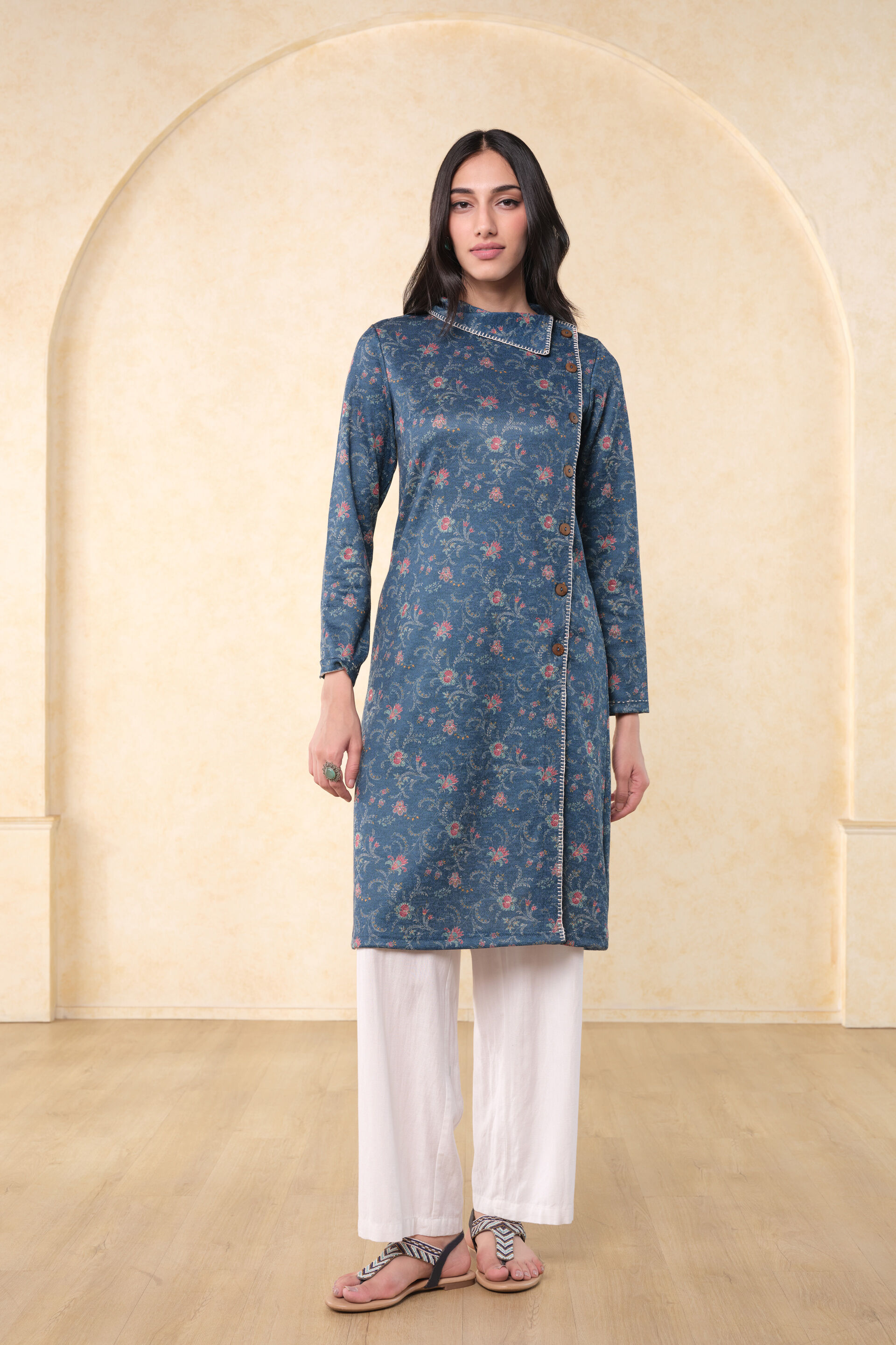 Up your winter style with our teal Bahara Tunic that features an asymmetric shawl collar. Designed in a comfortable knit fabric, it is highlighted with all-over floral prints, wooden buttons & blanket stitch details on the edge. A chic and effortless tunic, perfect for outdoor winter celebrations.
