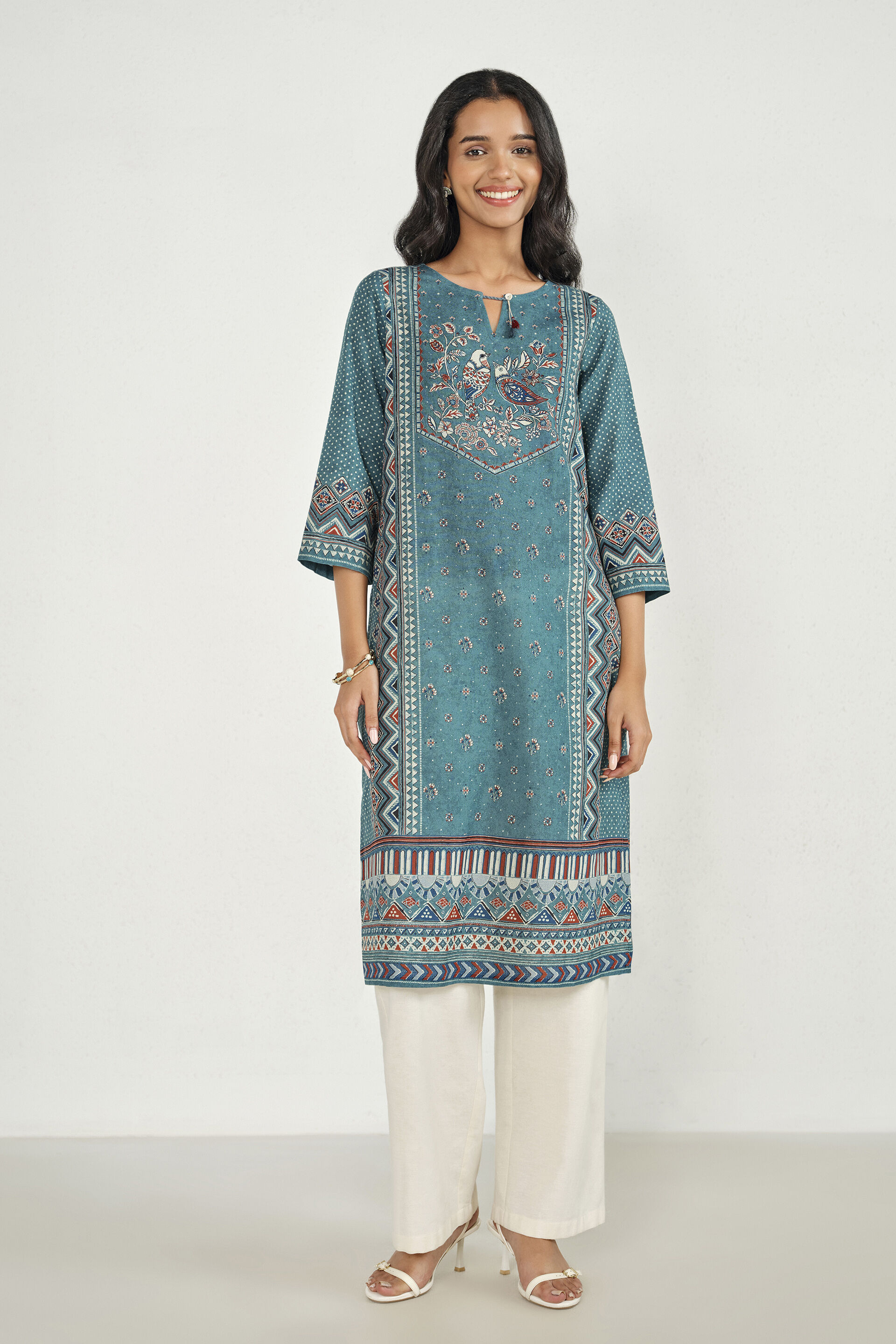 A straight mid-calf kurta in a blue tone featuring a detailed bird and floral placement print on the yoke, with co-ordinating border prints. Designed in rayon with three-quarter sleeves and a round neckline with slit in a slip-in silhouette.