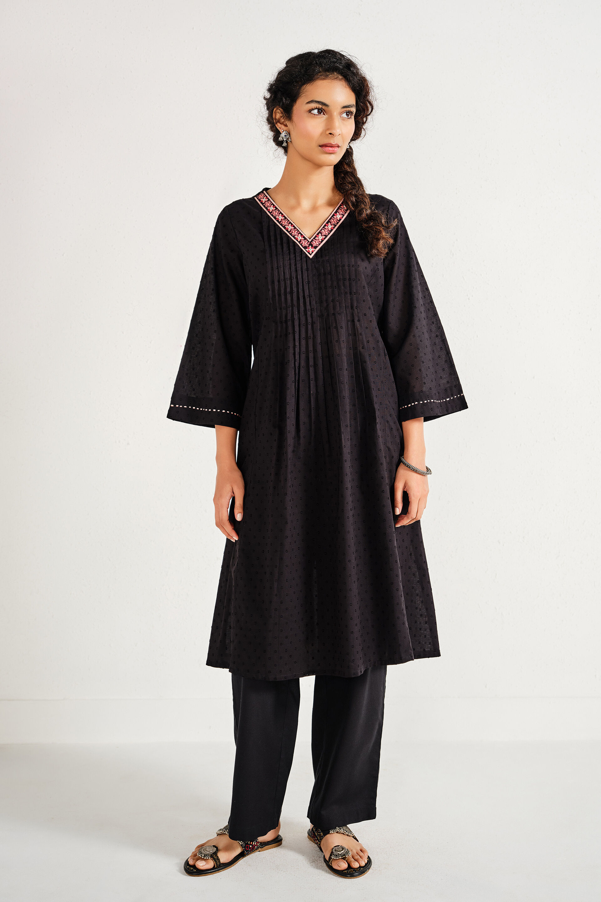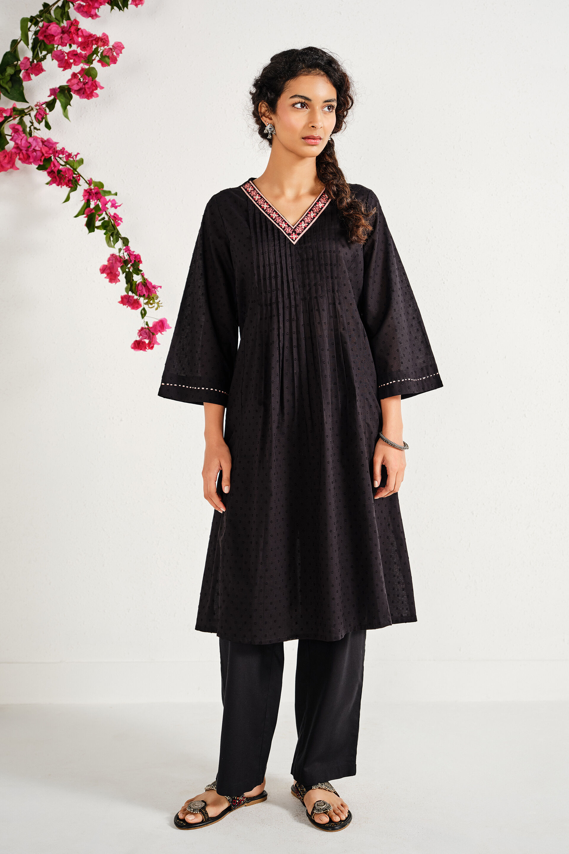 A black A-line kurta in pure cotton designed with a V-neck, three-quarter sleeves, mid-calf length, and pleats for everyday comfort.