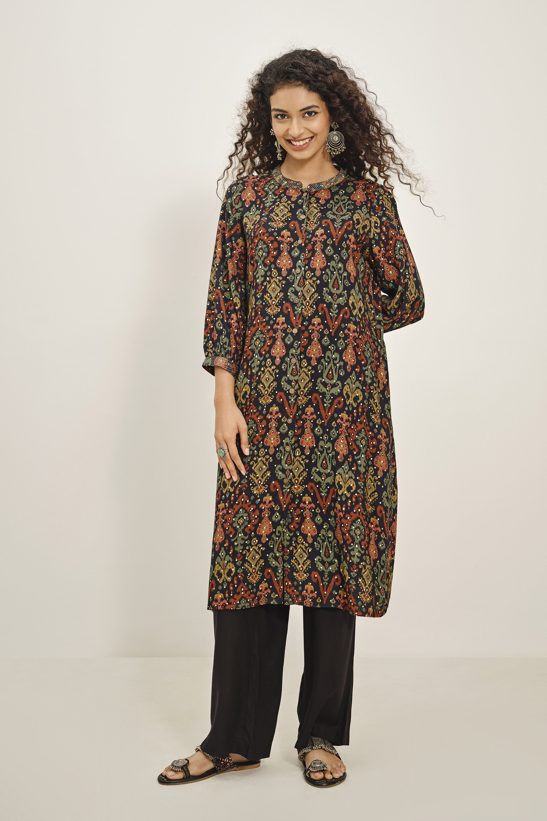 The Black Kamaal Kurta is knee-length and features a bold print on a straight silhouette. Designed in viscose with a band neckline and three-quarter sleeves, it brings ease and style to everyday dressing, best paired with slim trousers or casual flats.