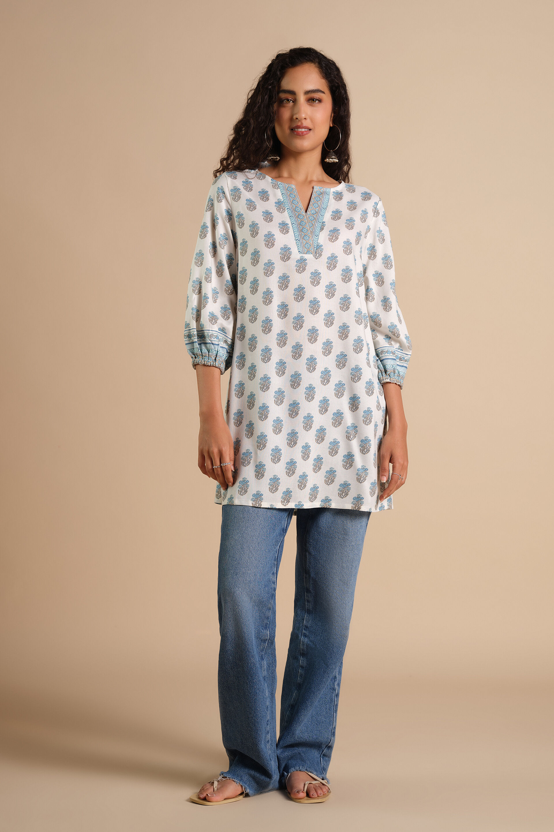 For days you're in the mood to keep it relaxed, go for this fuss-free and elegant top. It comes with nature-inspired prints, three-quarter sleeves & a round neckline. Featuring a border detailing on the sleeves & neckline, this top is crafted in soft & flowy viscose fabric for ease & comfort. Pair it with flared pants, silver bangles & trailing earrings to complete your look.