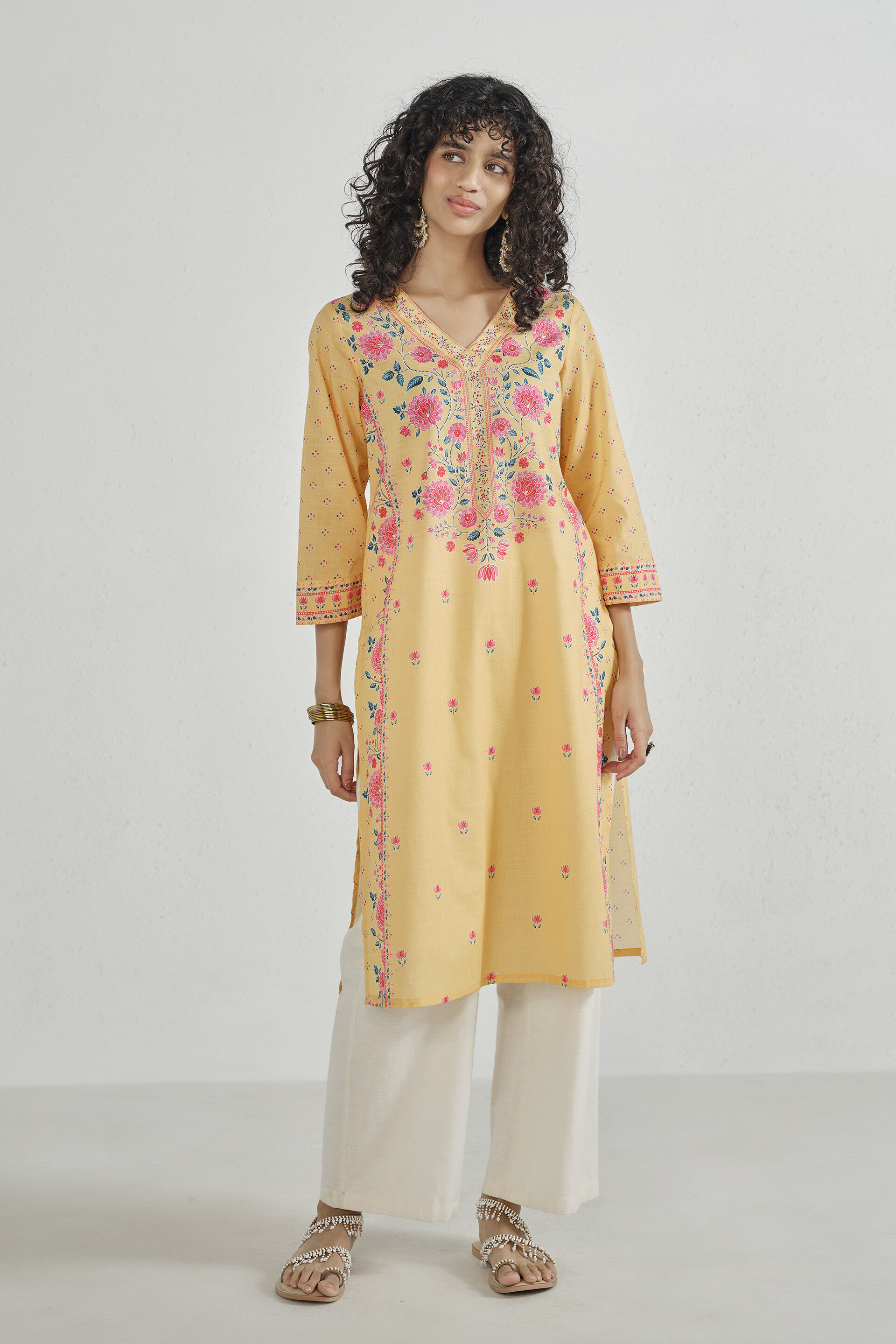 A butter yellow printed straight kurta in cotton featuring a V-neckline with placket, three-quarter sleeves, mid-calf length, and an easy slip-in silhouette.