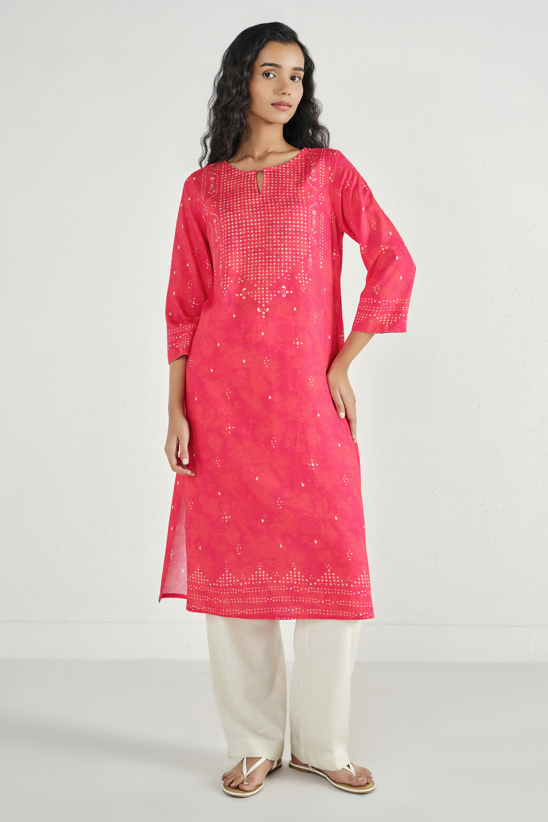 A printed straight kurta in a coral shade featuring a round neckline and slit, three-quarter sleeves, mid-calf length, and a comfortable slip-in silhouette.