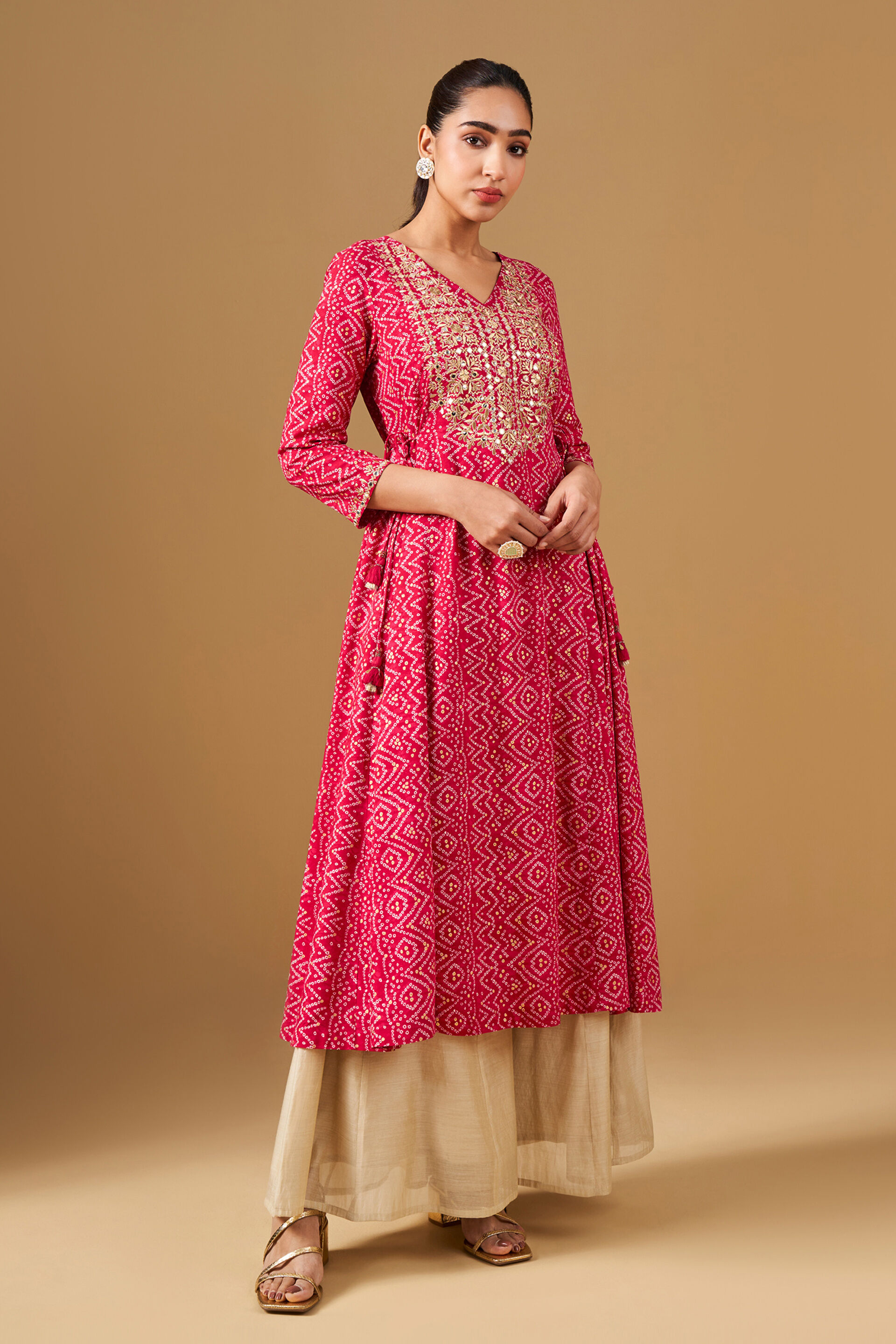 Be the star of the show at any event with this ethnic printed flared kurta. Featuring heavy embroidery along the neckline and sleeve ends, this kurta is perfect for anything from a puja to a sangeet night. This kurta has been crafted using 100% viscose.