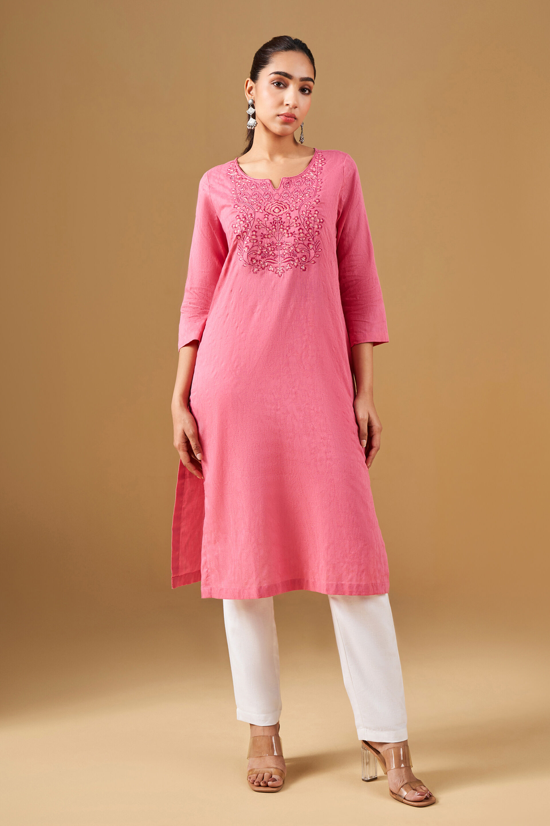 Brighten up your wardrobe with this coral kurta. Featuring delicate embroidery along the neckline, this comfort fit knee length kurta is crafted using 100% cotton.