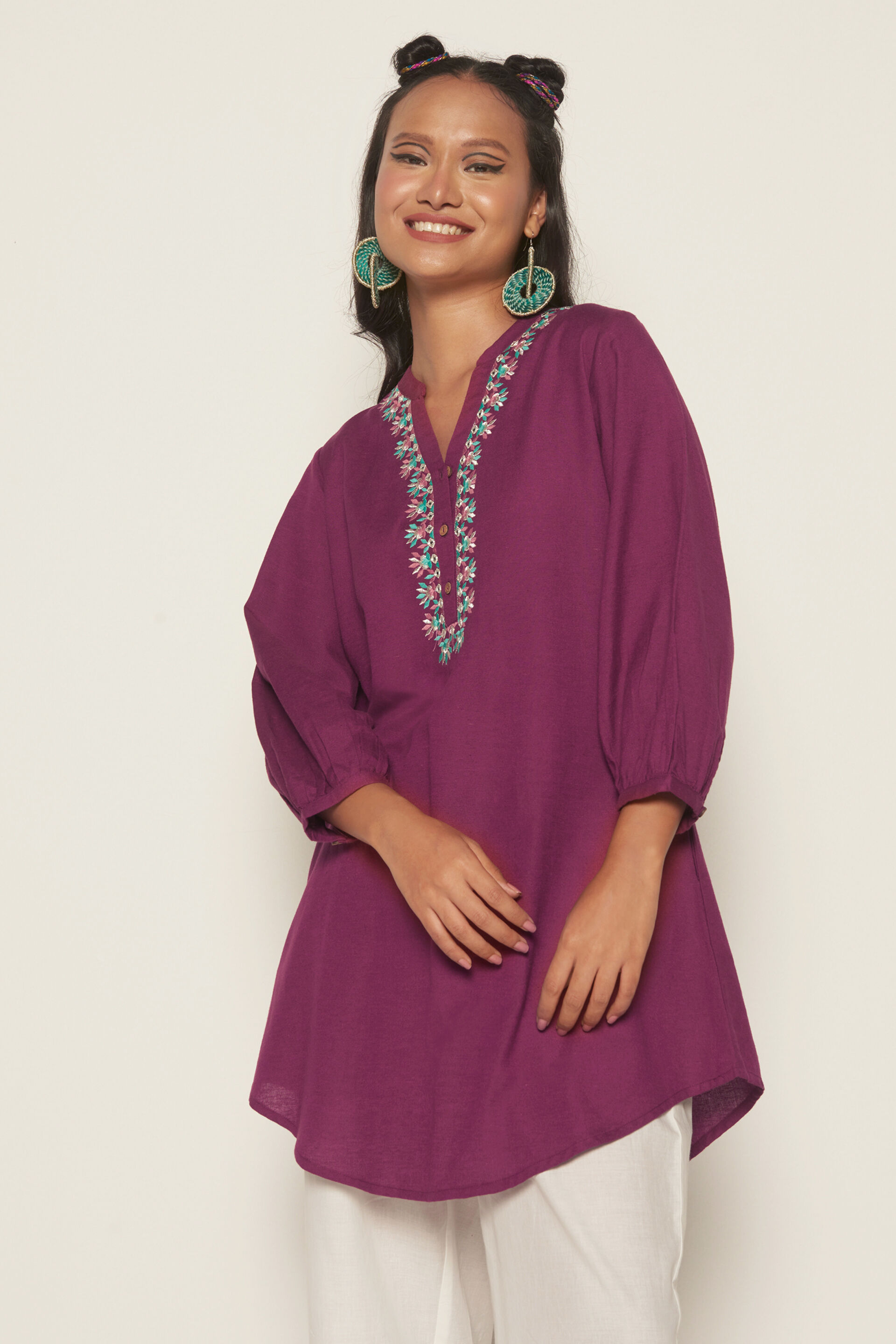 Adorned with embroidery on a bold hue, this tunic is all you need to be carefree and stylish all at once.