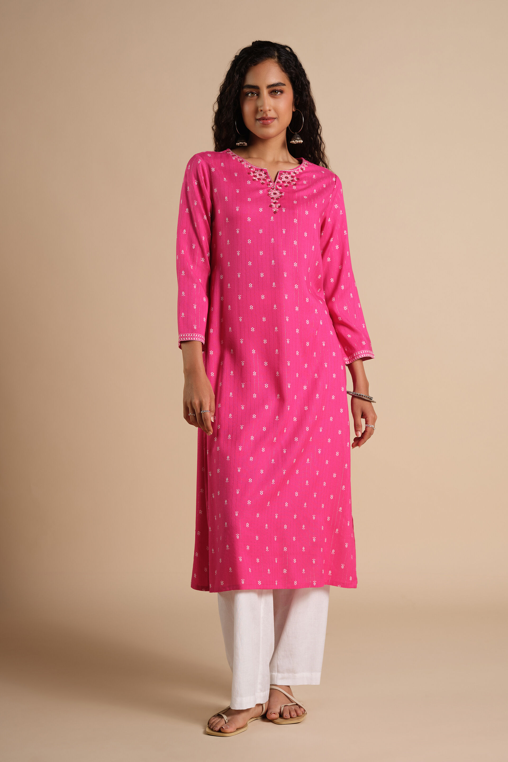 Get ready for summer celebrations in our ecleclic & vibrant kurta. Made from a soft and flowy viscose fabric, this kurta features thread embroidery, three-quarter sleeves & a round neckline. Pair it with straight or flared pants to ensure that you stay stylish and comfortable throughout any celebration.