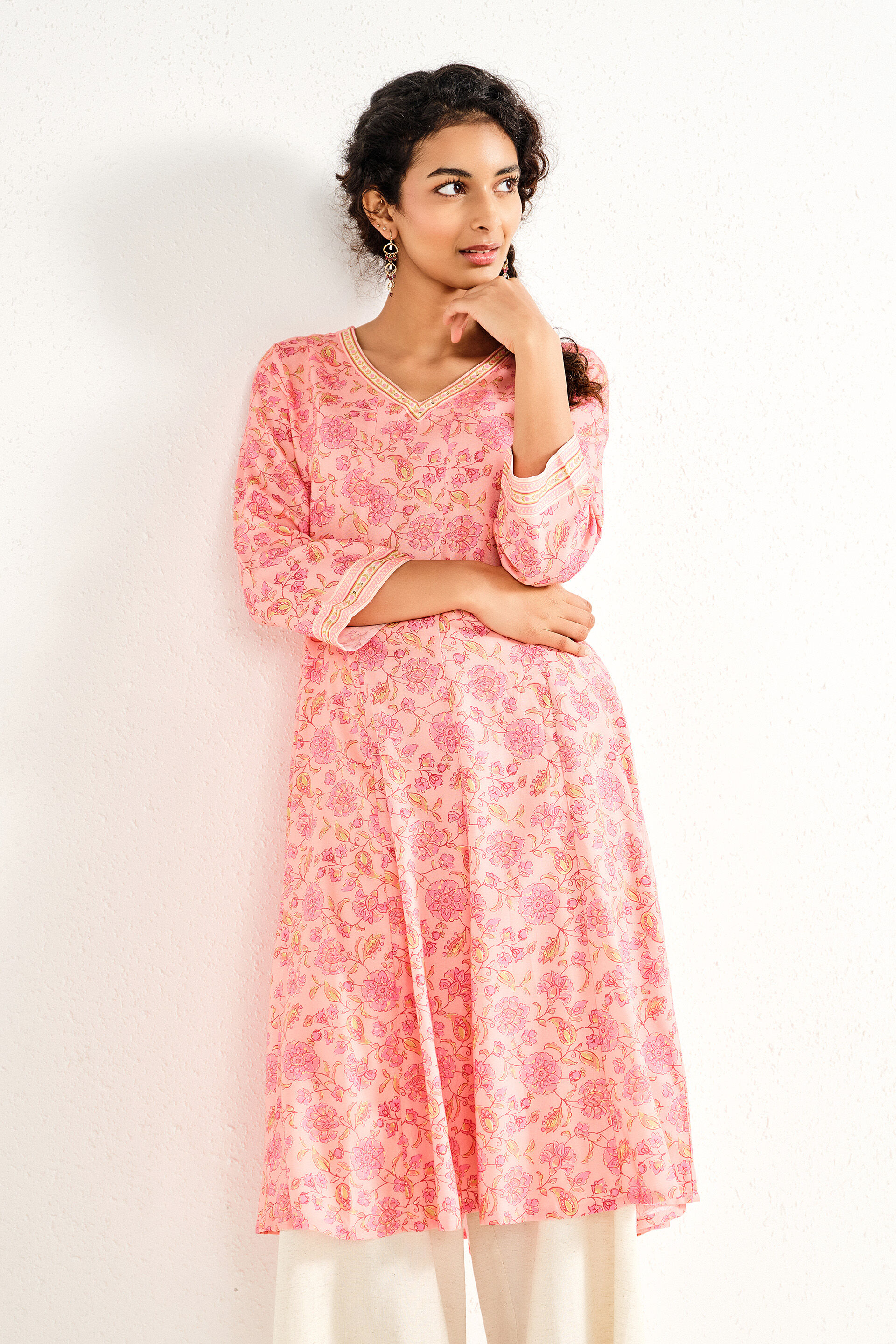 A pink viscose A-line kurta featuring a V-neck, three-quarter sleeves, and a mid-calf length silhouette.