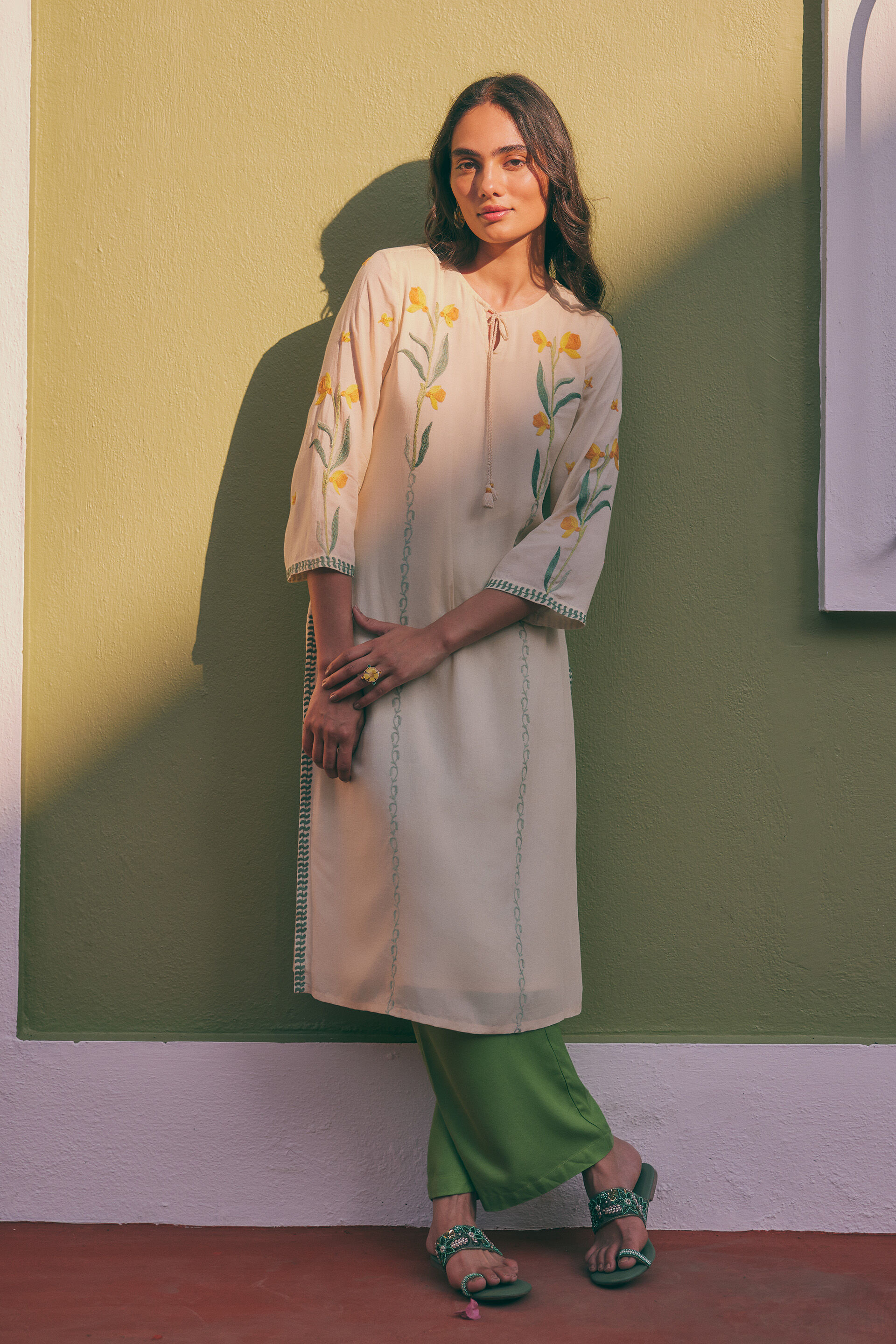 Perfect for summer, this floral kurta set features aari embroidery and India-inspired prints. Crafted in a mul & modal blend, this set feels soft & breathable on your skin. It comes with three-quarter bell sleeves and a round neckline with a drop. The solid wide-leg bottoms ensure that you can style up your looks with chic and dainty jewellery.