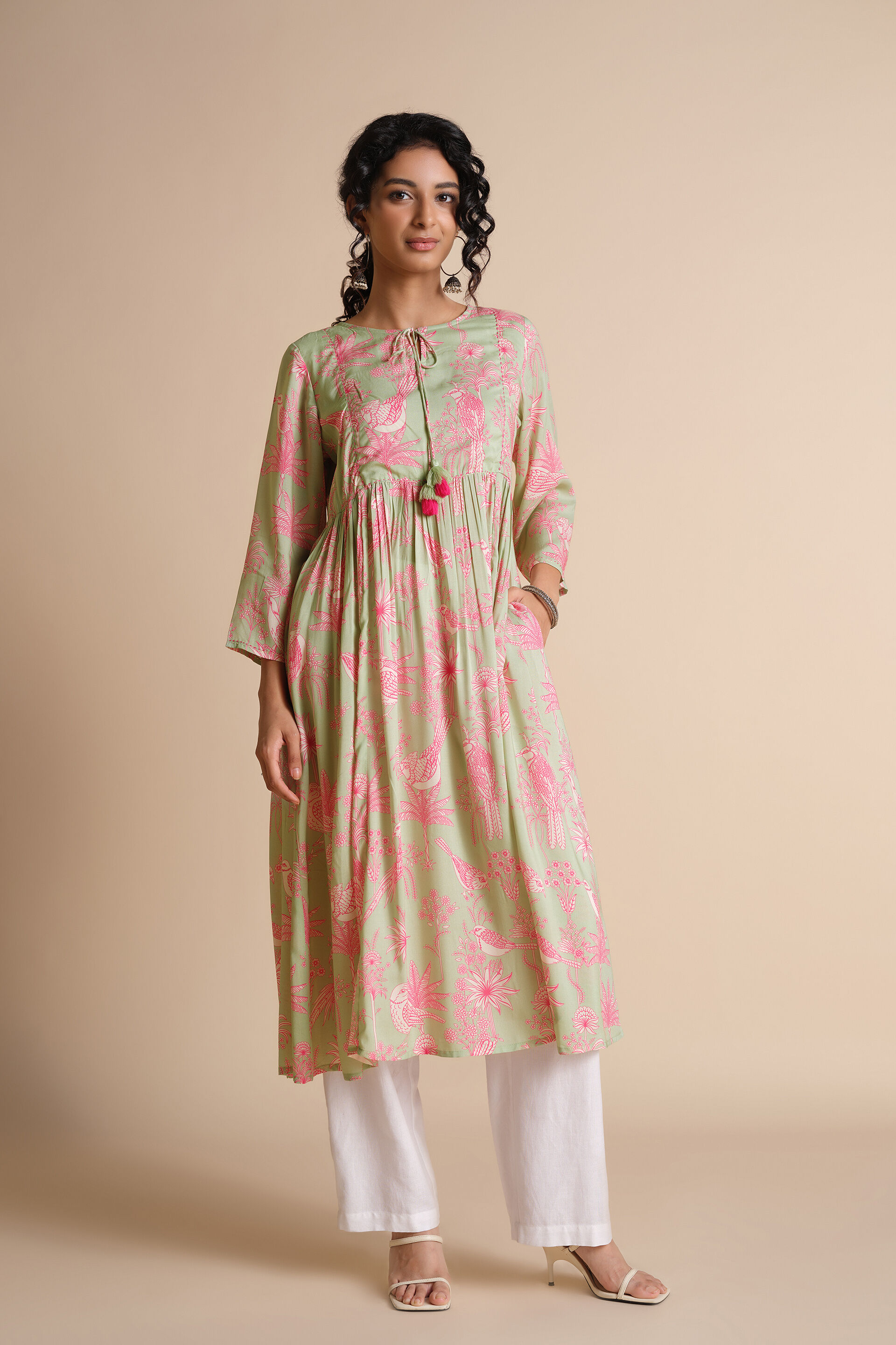 Crafted in a soft & breathable fabric, this kurta features vibrant inhabitants of nature for casual outings & relaxed weekends. Featuring gathers at front, this A-line kurta comes with tie-up detail on the neckline and three-quarter sleeves. The pockets on the side are for storing essentials.