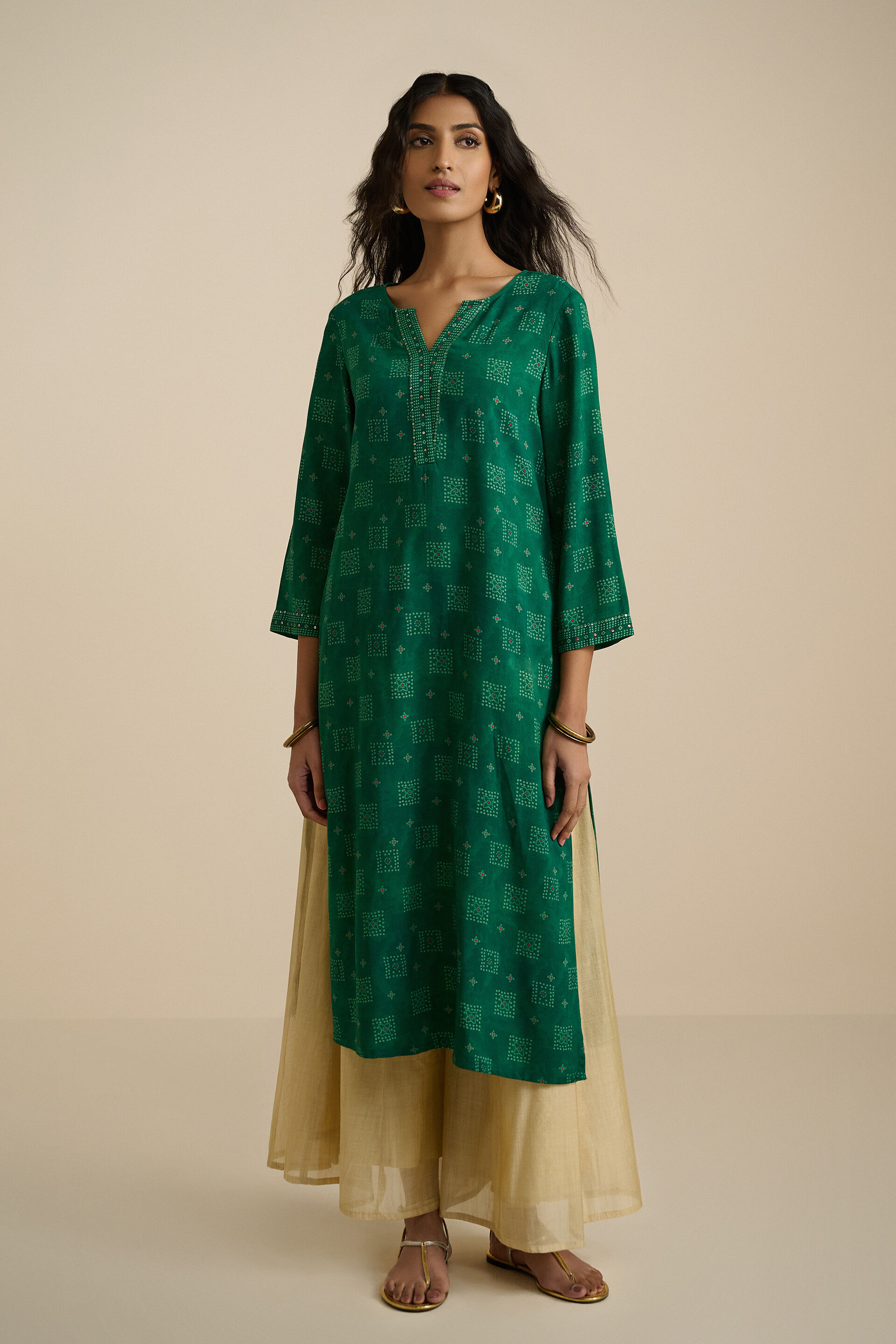 Our knee-length green kurti adds a pop of colour to the wardrobe with its solid texture. An A-line silhouette with 3/4-length sleeves features a lively V-neck, and its soft & breathable material is essential for days when the mercury level is at its peak.