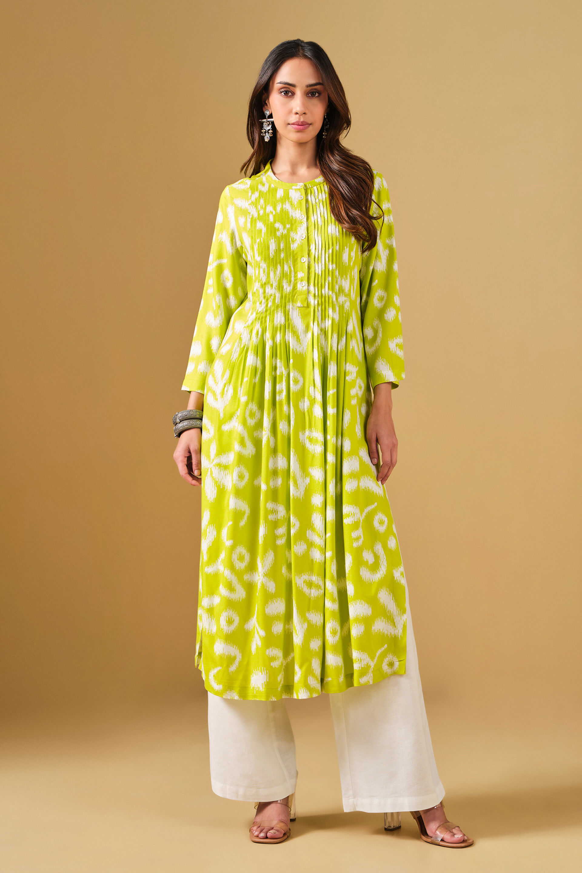 Keep your wardrobe simply stylish with this fun kurta. Featuring Ikat Inspired print with pintucks and puff sleeves, this kurta is all about embracing the colours of summer!