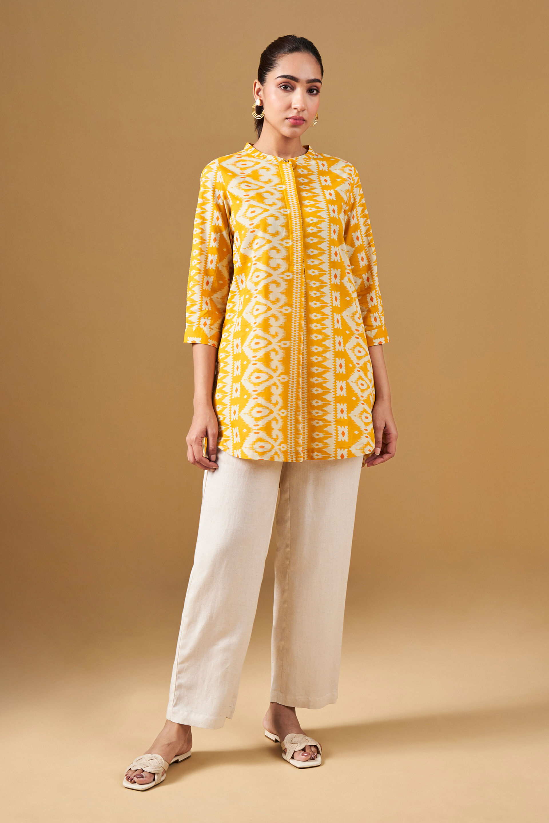 Light and breezy, this 100% cotton tunic features bold, Ikat inspired print. Boasting a mandarin collar and three quarter sleeves, this tunic elevates any basic look into a super stylish one.