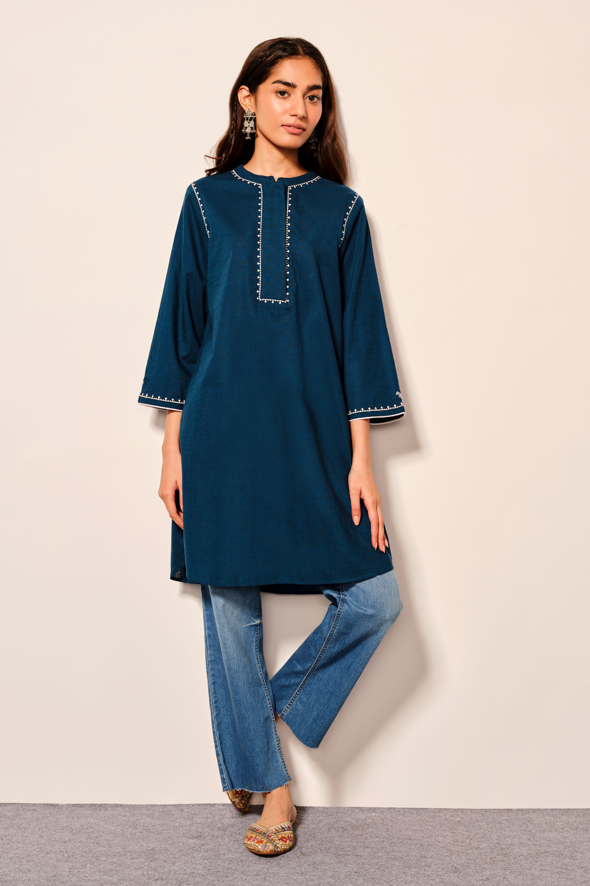 This chic indigo blue tunic is crafted from solid cotton slub and features contrast placement embroidery details at the front and sleeves. Perfect for office wear, formal meetings, and evening gatherings, this tunic offers a blend of elegance and sophistication. Pair it with matching pants for a complete look.