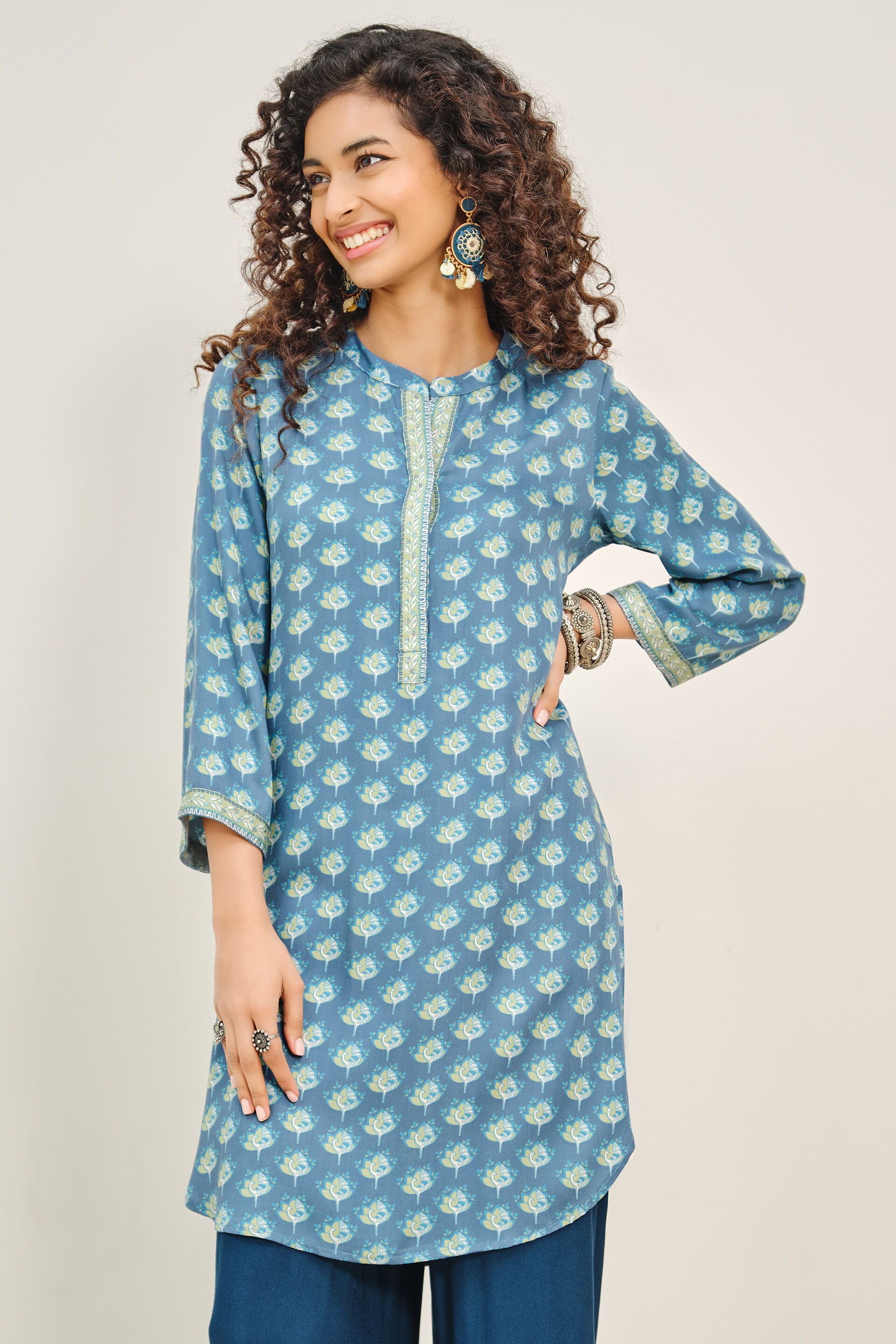 An indigo tunic that brings that cool-girl ease to everyday dressing. With a band neck, mid-length rounded hem, and subtle sheen from modal satin, it’s perfect for workdays, brunches, or carefree evening strolls.