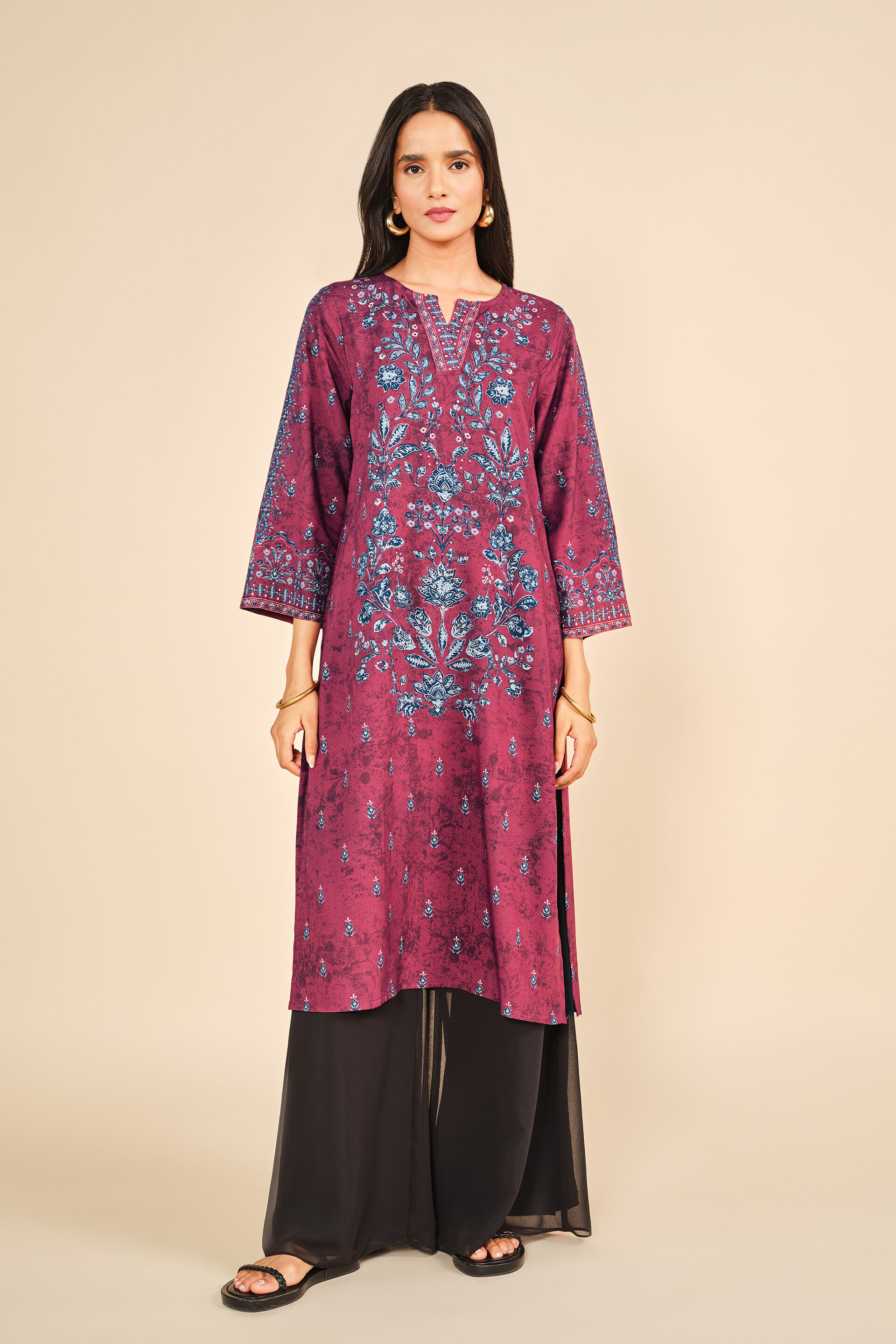 This beautiful kurta features an India inspired print and is crafted using breathable & soft viscose fabric. Featuring a round neckline & three-quarter sleeves, this deep-hued kurta offers all-day comfort. Ideal for casual gatherings, festive celebrations, and informal events.