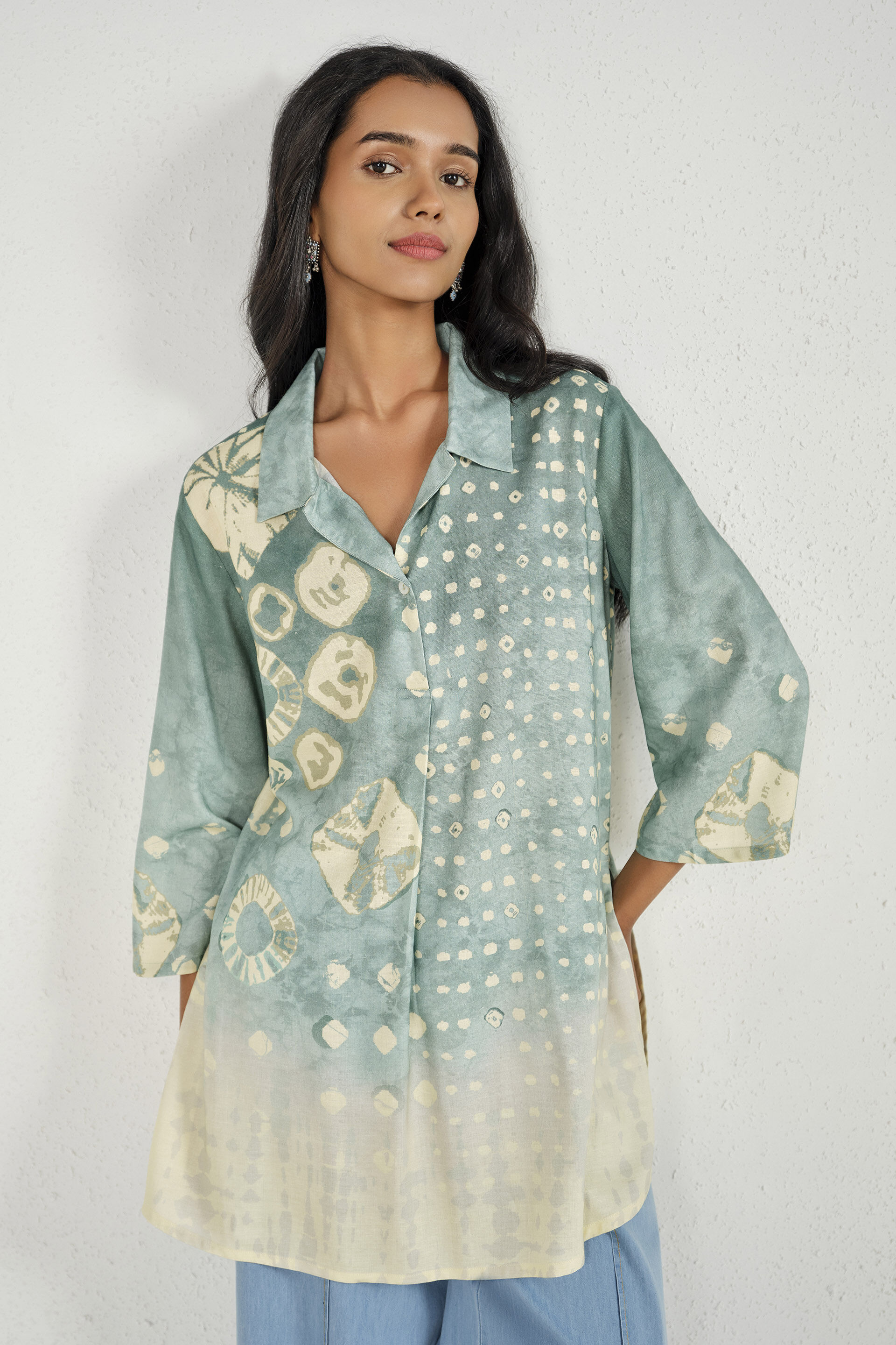 A teal printed shirt-style tunic featuring a collared neckline and three-quarter sleeves. Designed in a relaxed boxy silhouette with a rounded mid-thigh hem and slip-in fit.