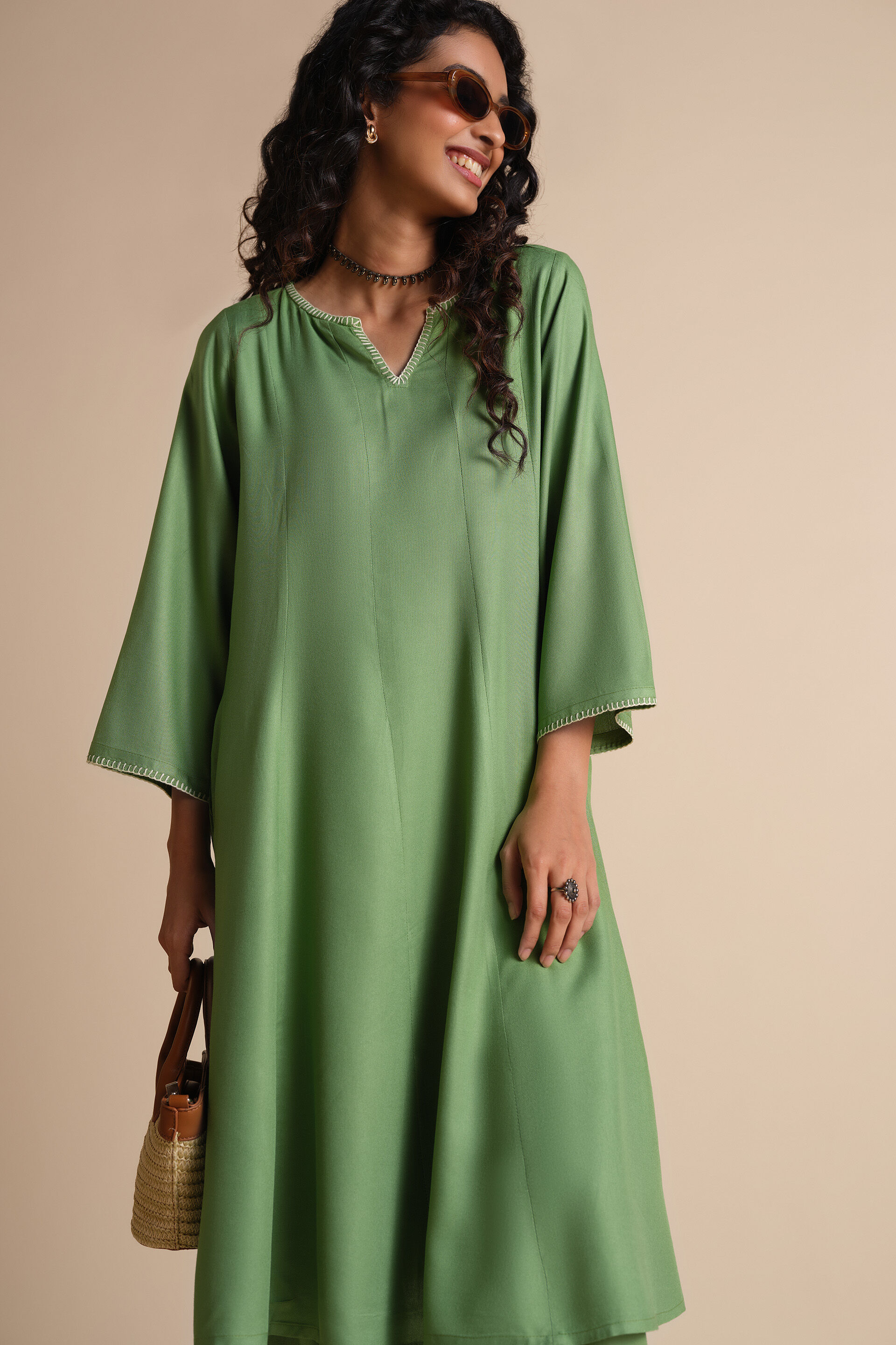 Embrace the essence of timeless elegance with this solid kurta. This kurta is crafted from soft, breathable, and eco-friendly viscose fabric for ultimate comfort. The fit-and-flare kurta is elevated with delicate threadwork along the neckline and sleeves, making it great for daytime. Pair it with matching bottoms & brown sandals to look chic.