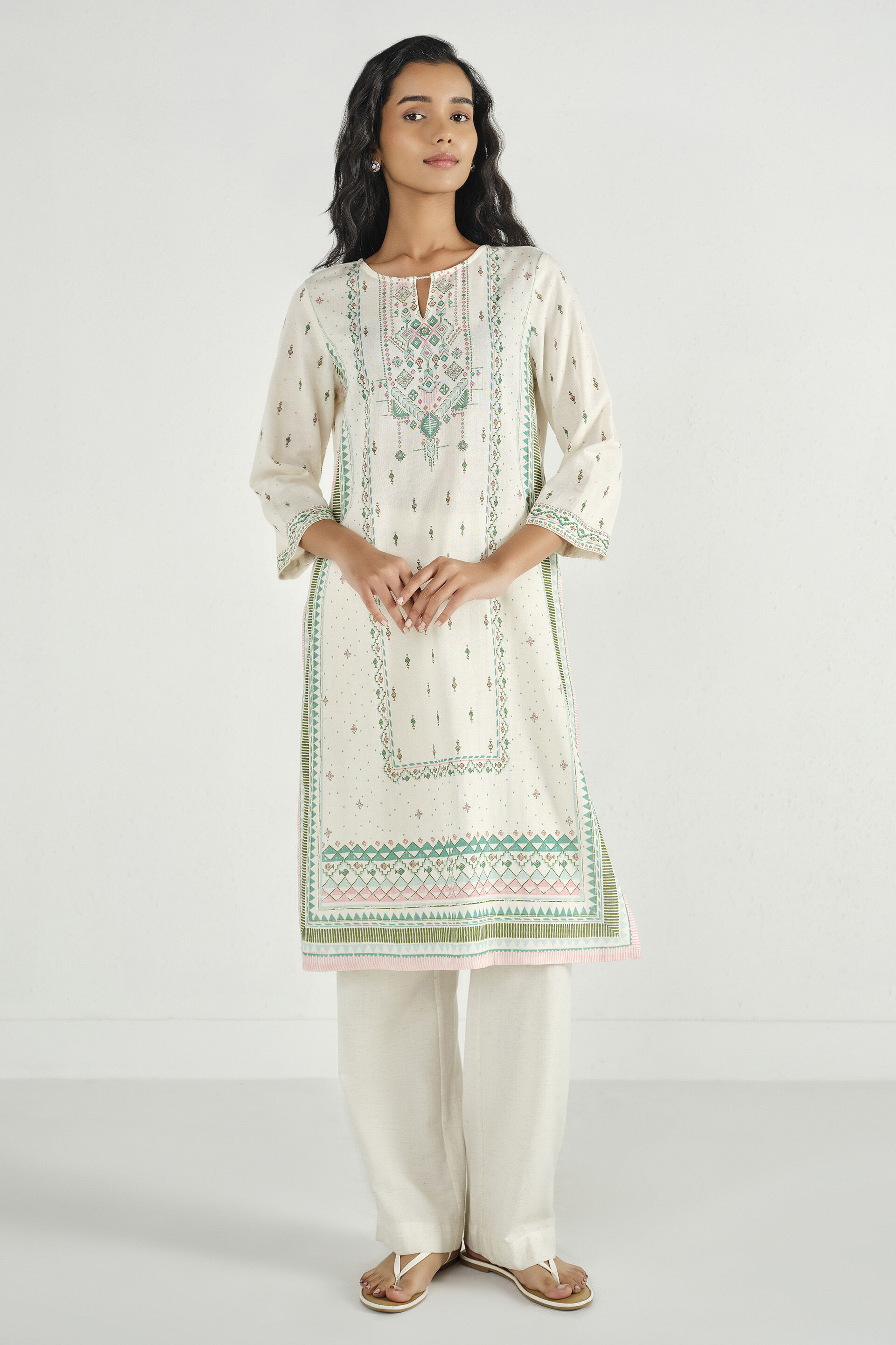 An off-white straight kurta featuring a round neckline with slit, three-quarter sleeves, mid-calf length, and an easy slip-in fit.