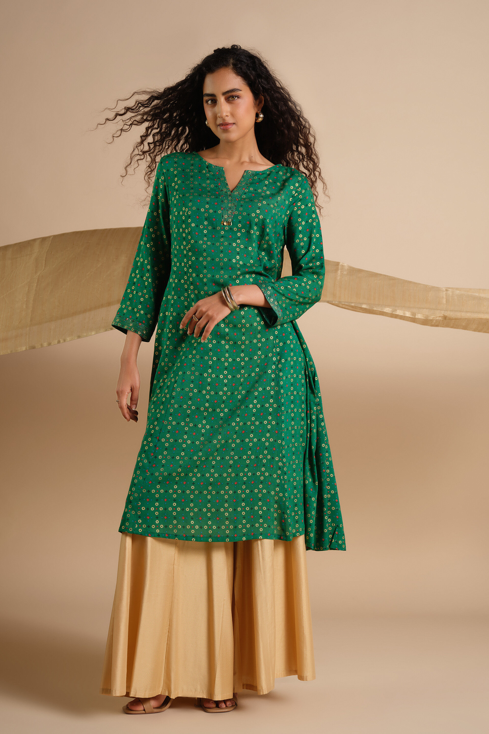 Add a touch of vibrance with this stunning green kurta. Made from soft & breathable viscose fabric, it features India-inspired prints and playful coin details around the neck, making it perfect for celebrations. This kurta comes in a fit-and-flare silhouette with three-quarter sleeves and a round neckline. Style it with straight or flared pants for an effortlessly chic look.
